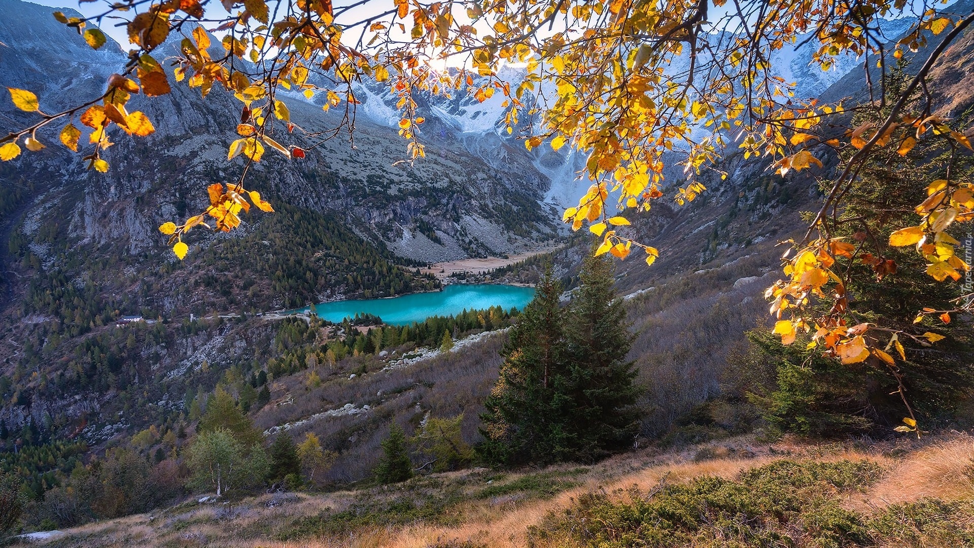 Edytor tapety: Widok zza gałęzi drzewa na górskie jezioro