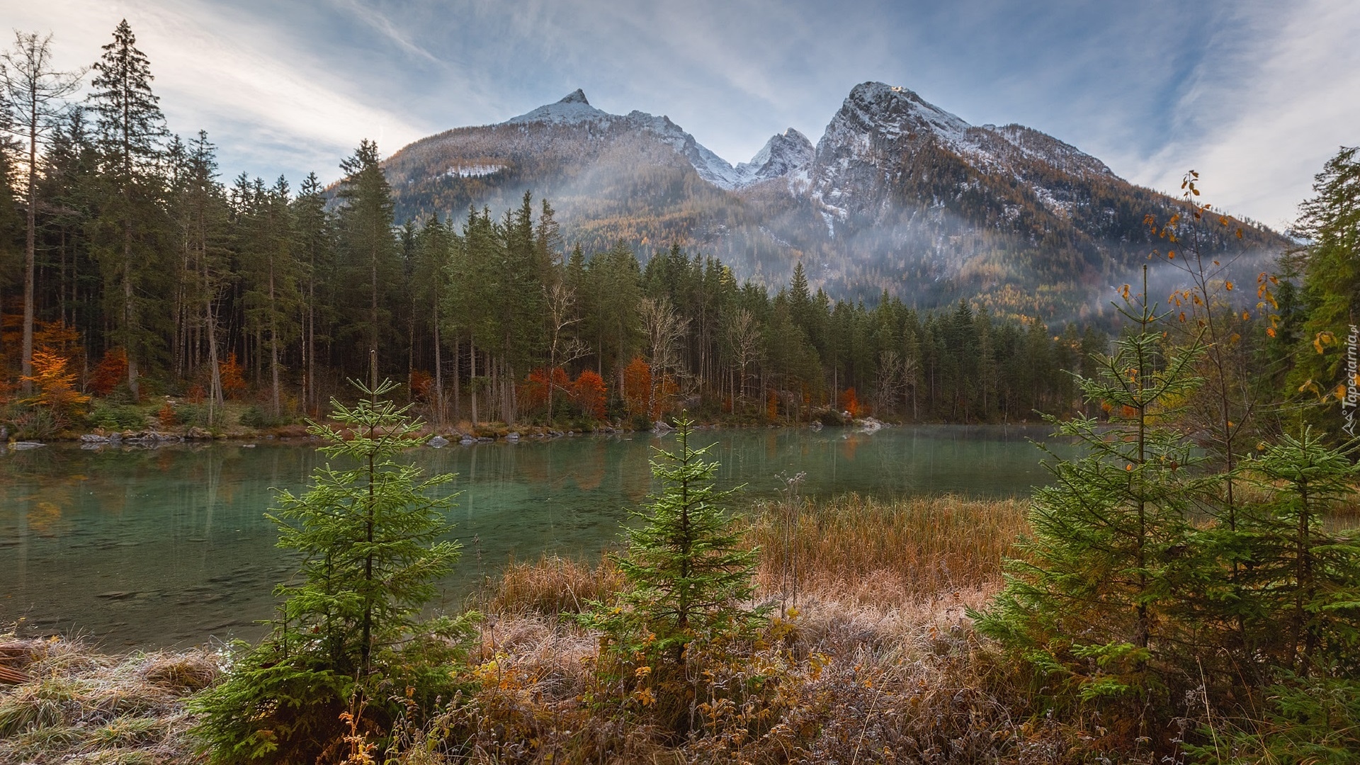 Edytor tapety: Drzewa na pożółkłej trawie nad górskim jeziorem