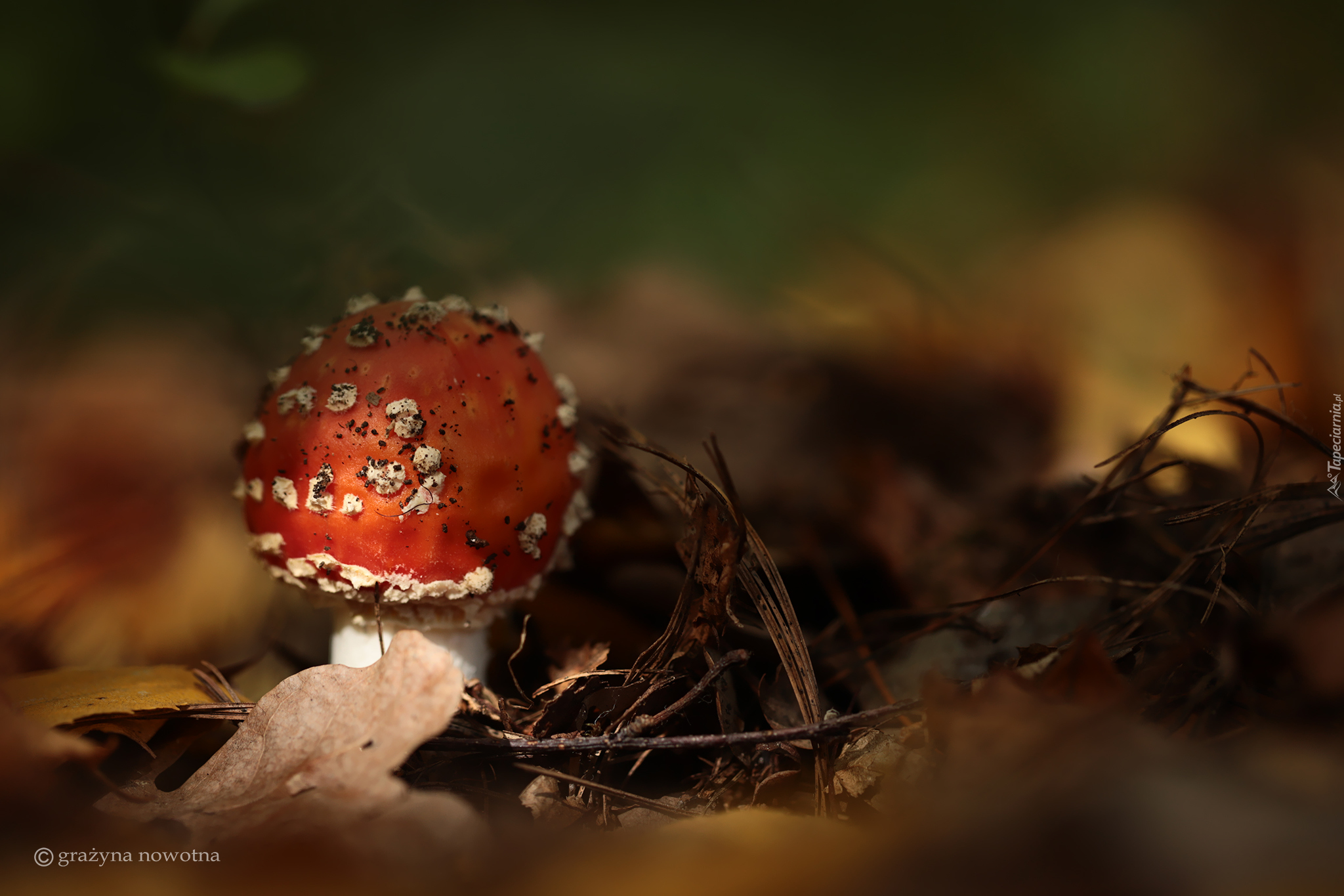 Edytor tapety: Czerwony muchomor w liściach