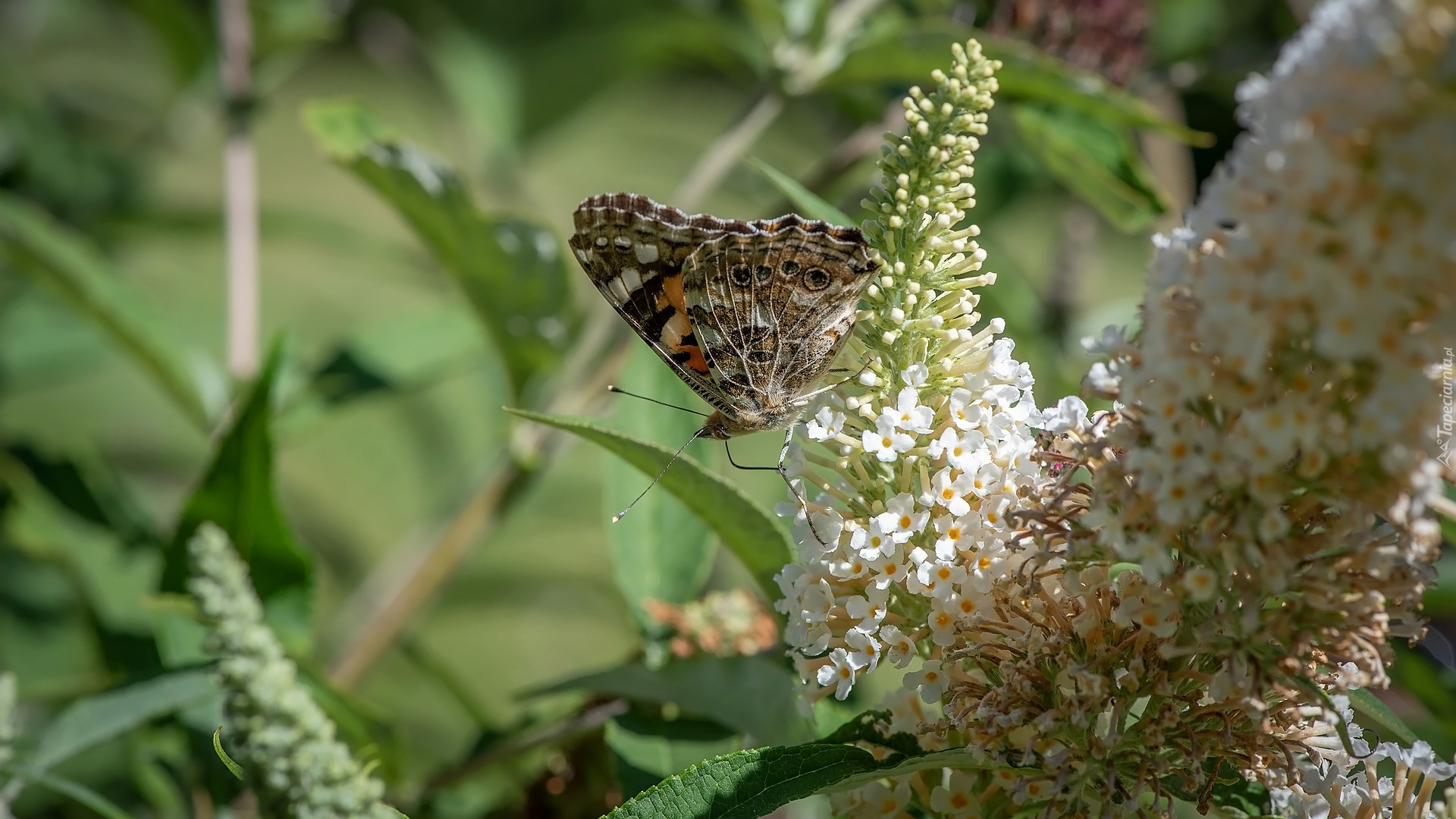 Edytor tapety: Rusałka admirał na białych kwiatach budlei
