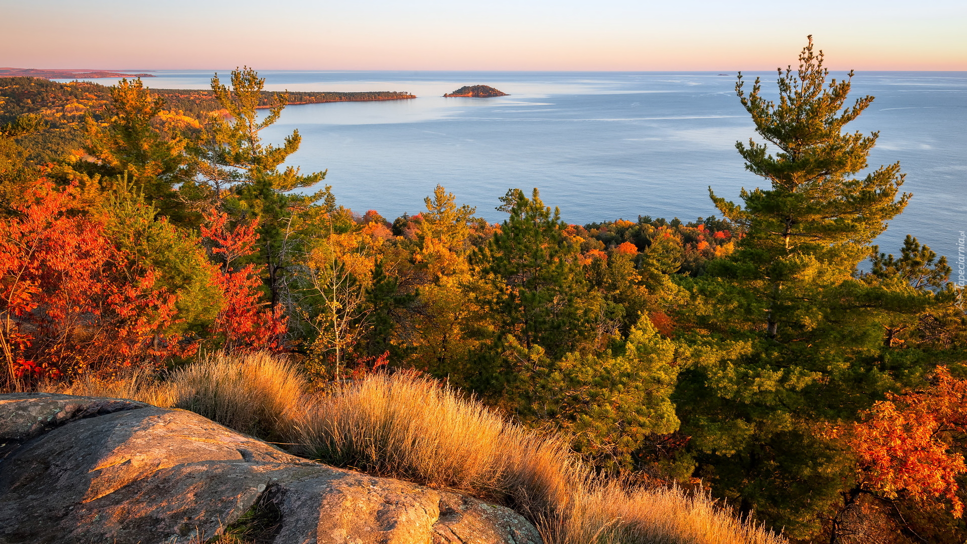 Edytor tapety: Widok znad jesiennych drzew na jezioro Superior Lake