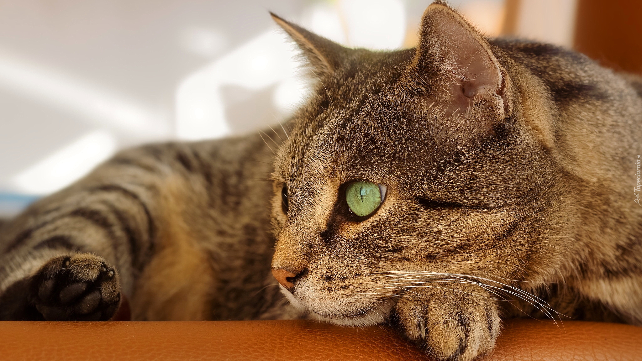 Edytor tapety: Bury zielonooki kot leżący na kanapie