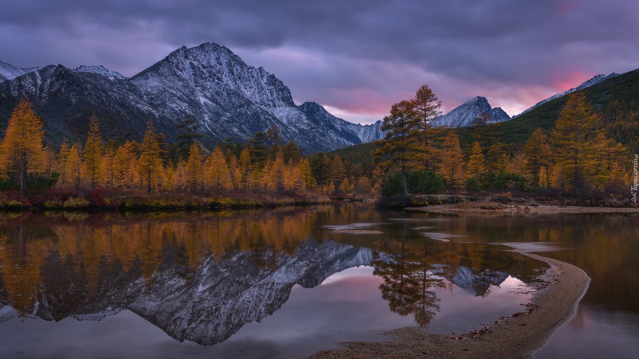 Edytor tapety: Góry i jesienne drzewa odbijające się w jeziorze
