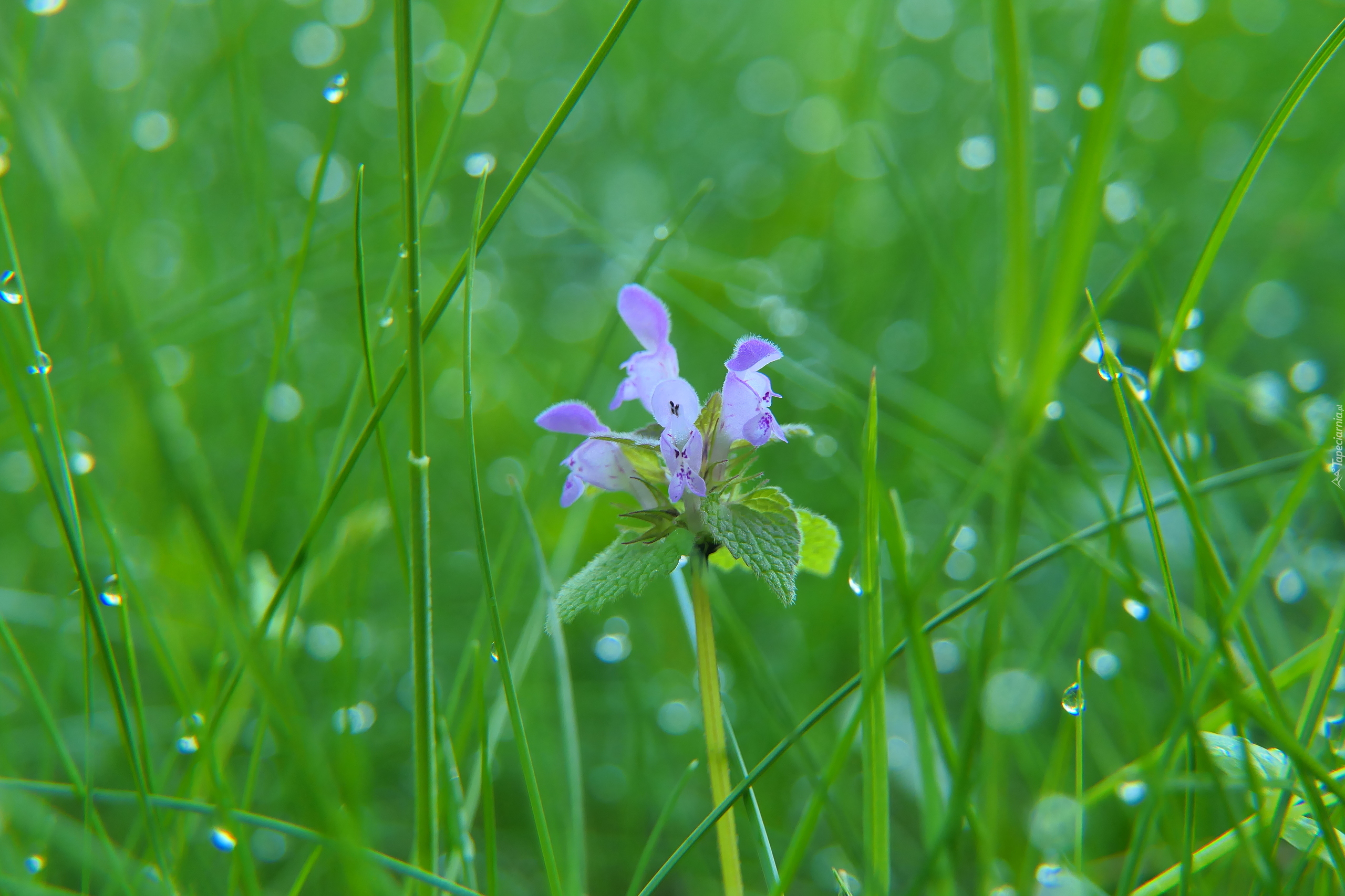 Edytor tapety: Jasnota purpurowa w mokrej trawie