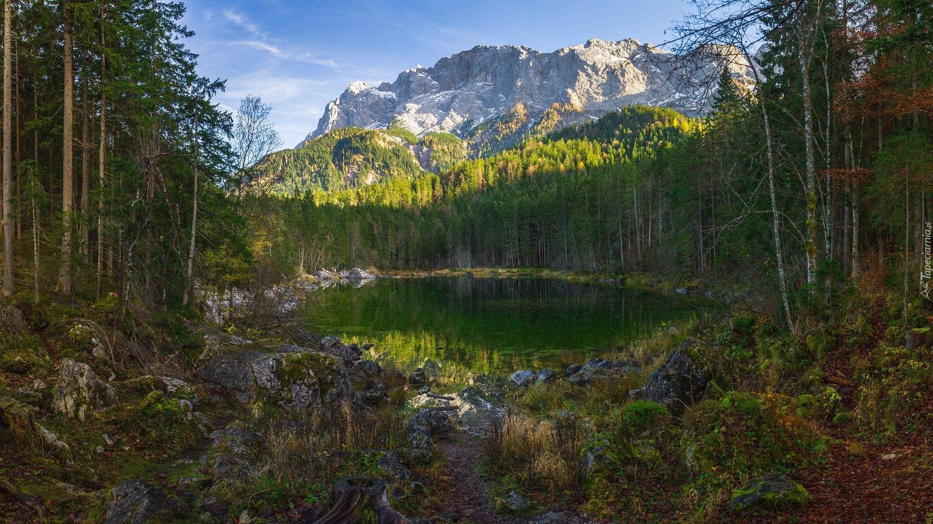 Edytor tapety: Drzewa nad jeziorem u podnóża gór