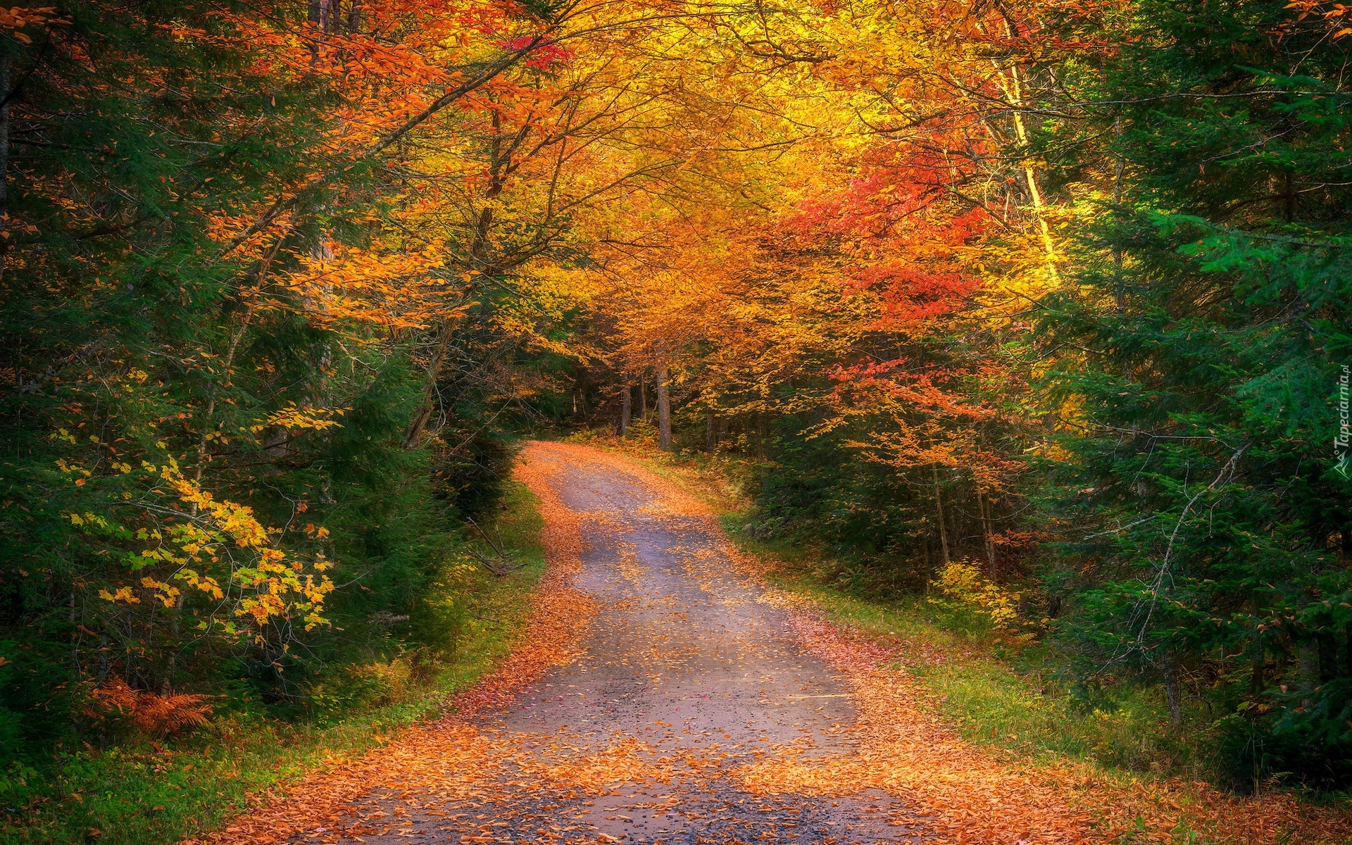 Edytor tapety: Pożółkłe drzewa przy leśnej drodze