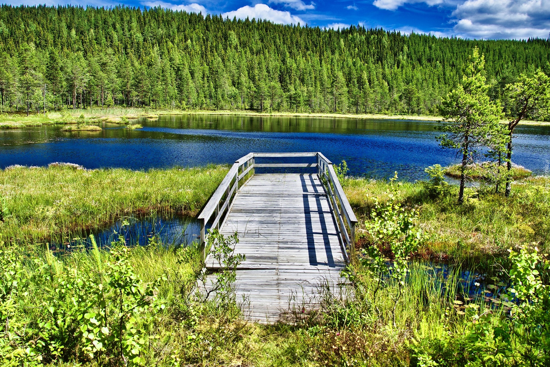 Edytor tapety: Widok z pomostu na jezioro i zielone drzewa