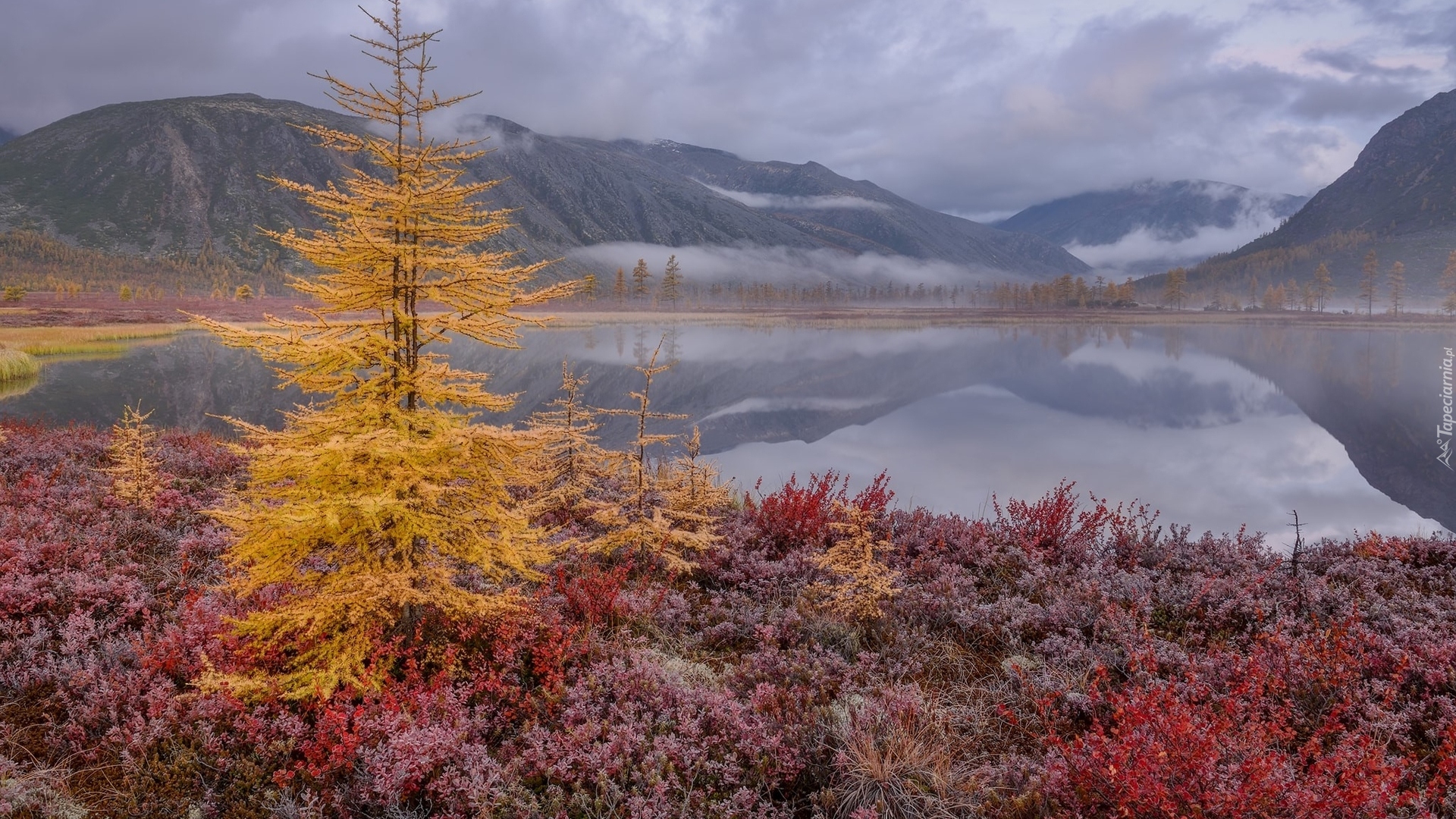 Edytor tapety: Kolorowa jesienna roślinność nad zamglonym jeziorem Jack London