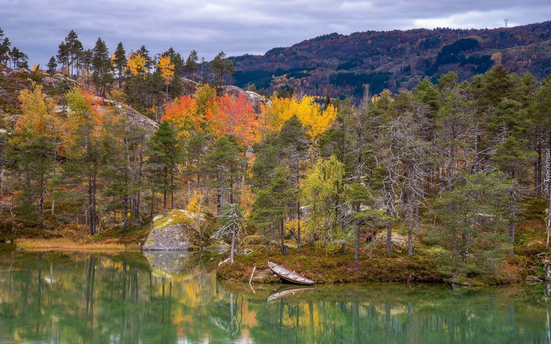 Edytor tapety: Łódka na brzegu jeziora i jesienne drzewa dookoła