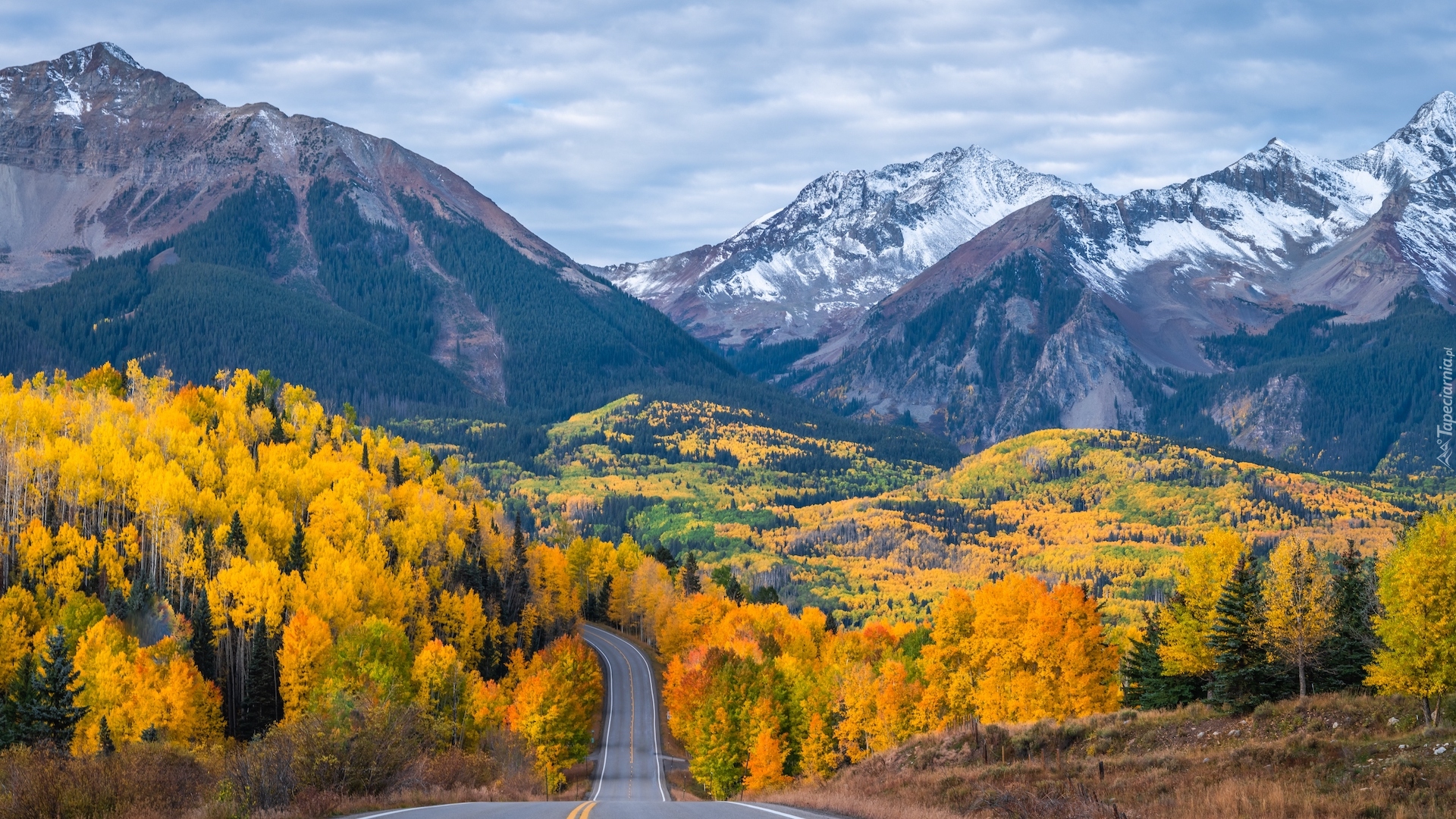 Edytor tapety: Droga pośród kolorowych drzew w kierunku gór