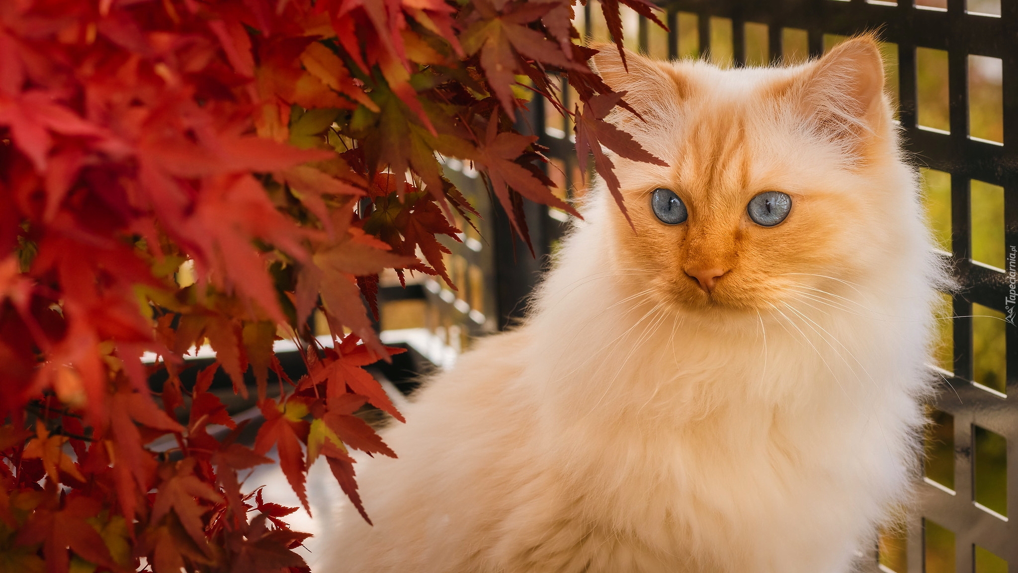 Edytor tapety: Niebieskooki rudy kot obok liści