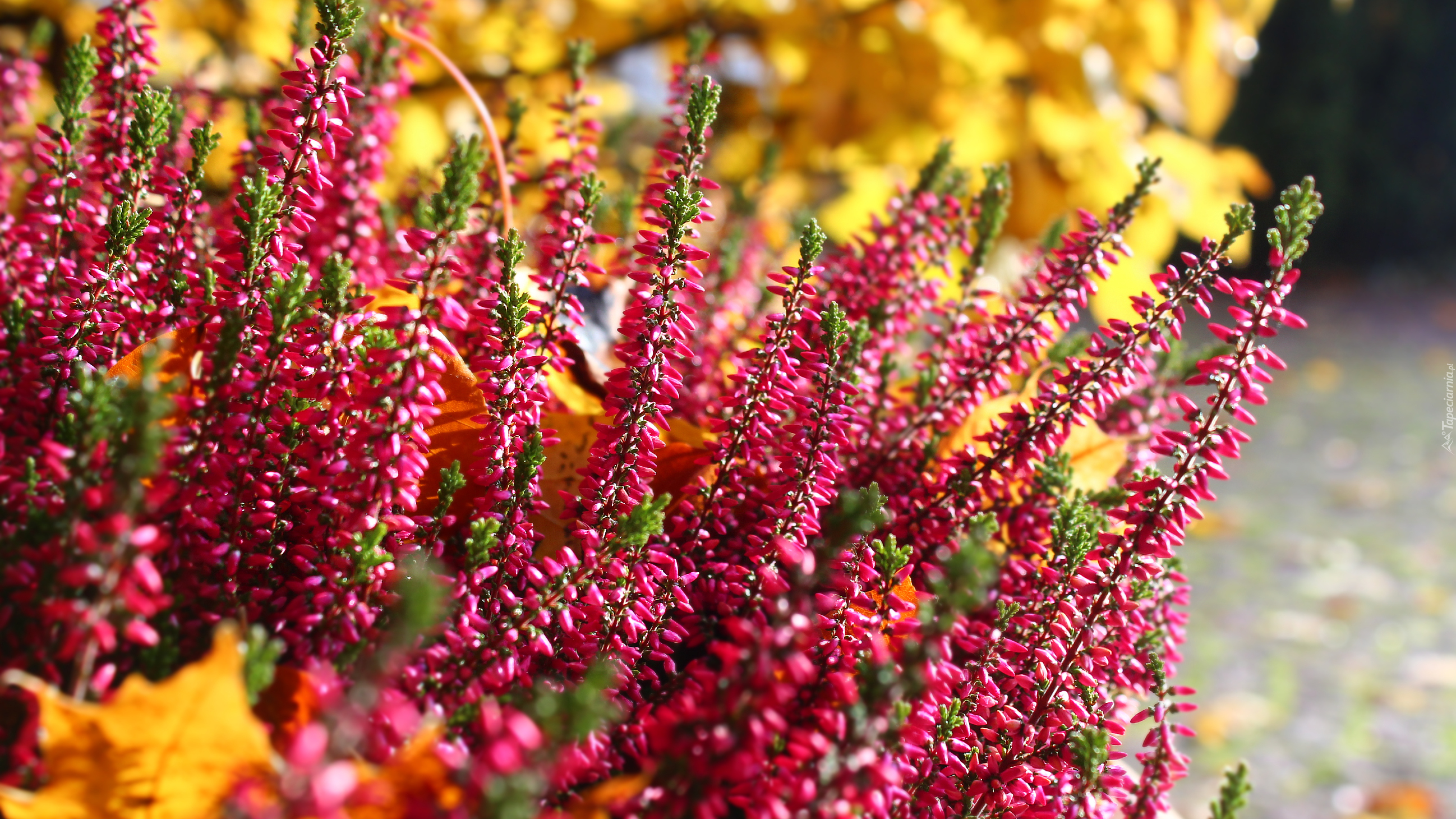 Edytor tapety: Różowy wrzos na tle rozmytych liści