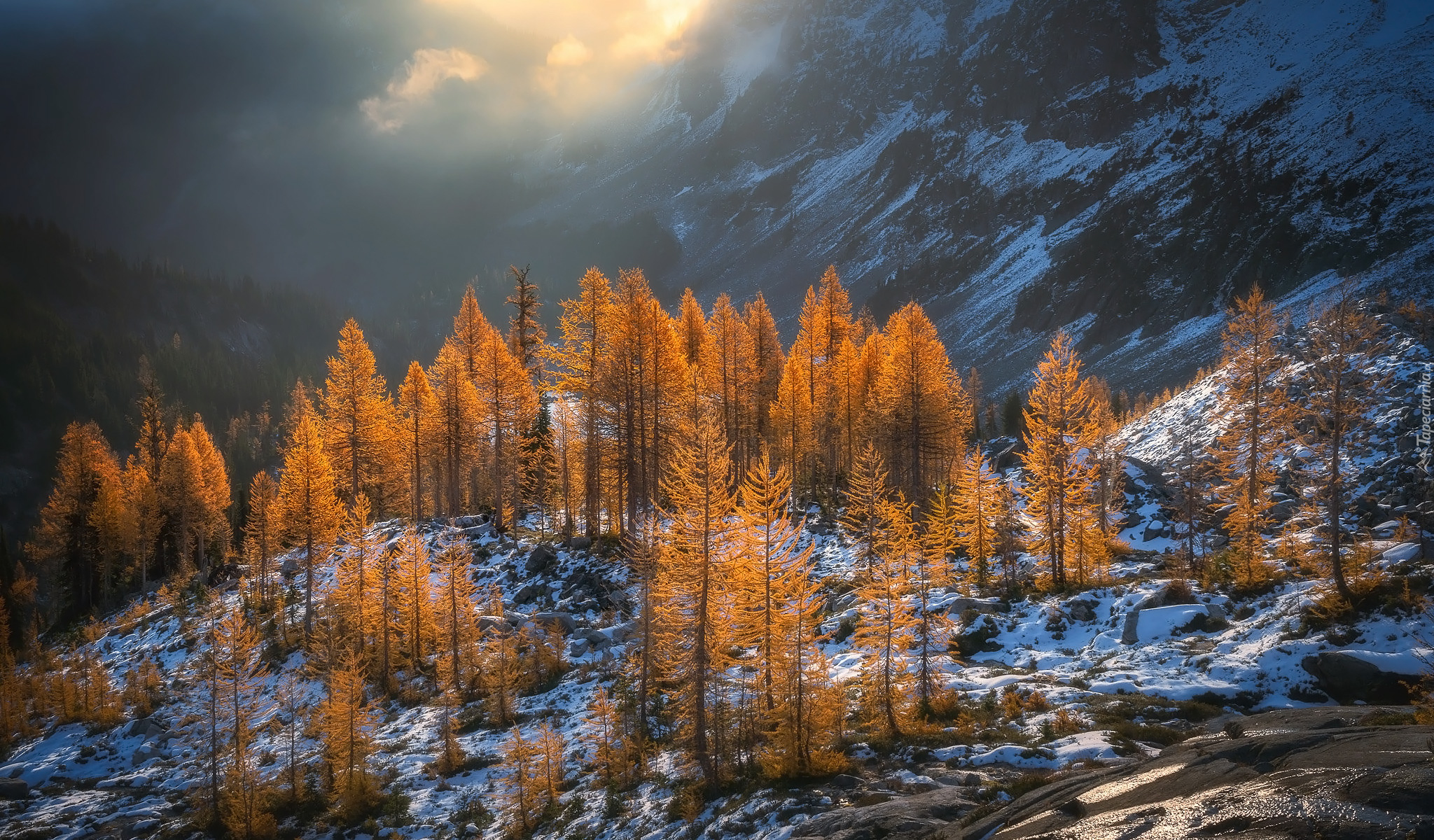Edytor tapety: Pożółkłe drzewa na tle zamglonej góry