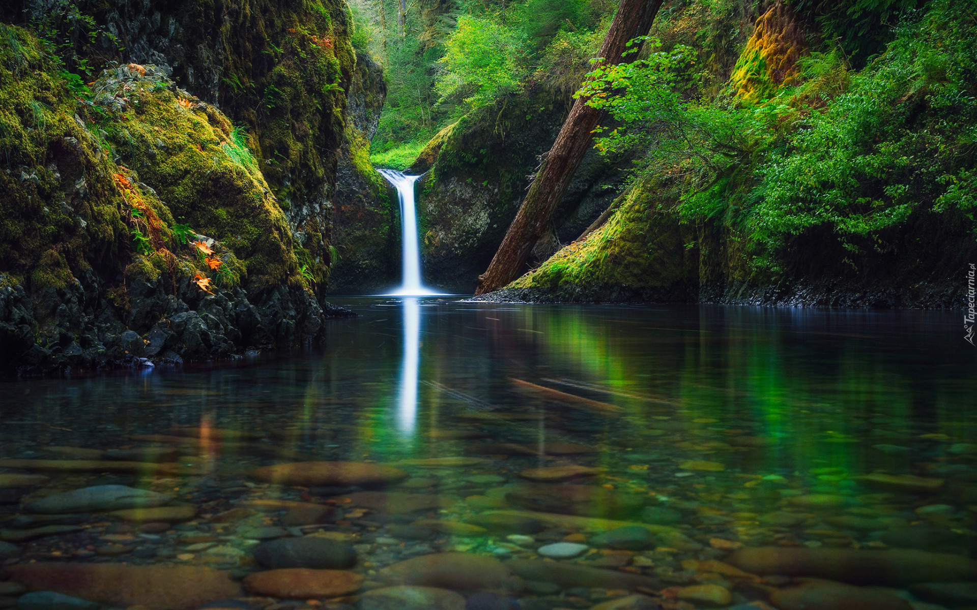 Edytor tapety: Mały wodospad na skale wpadający do rzeki