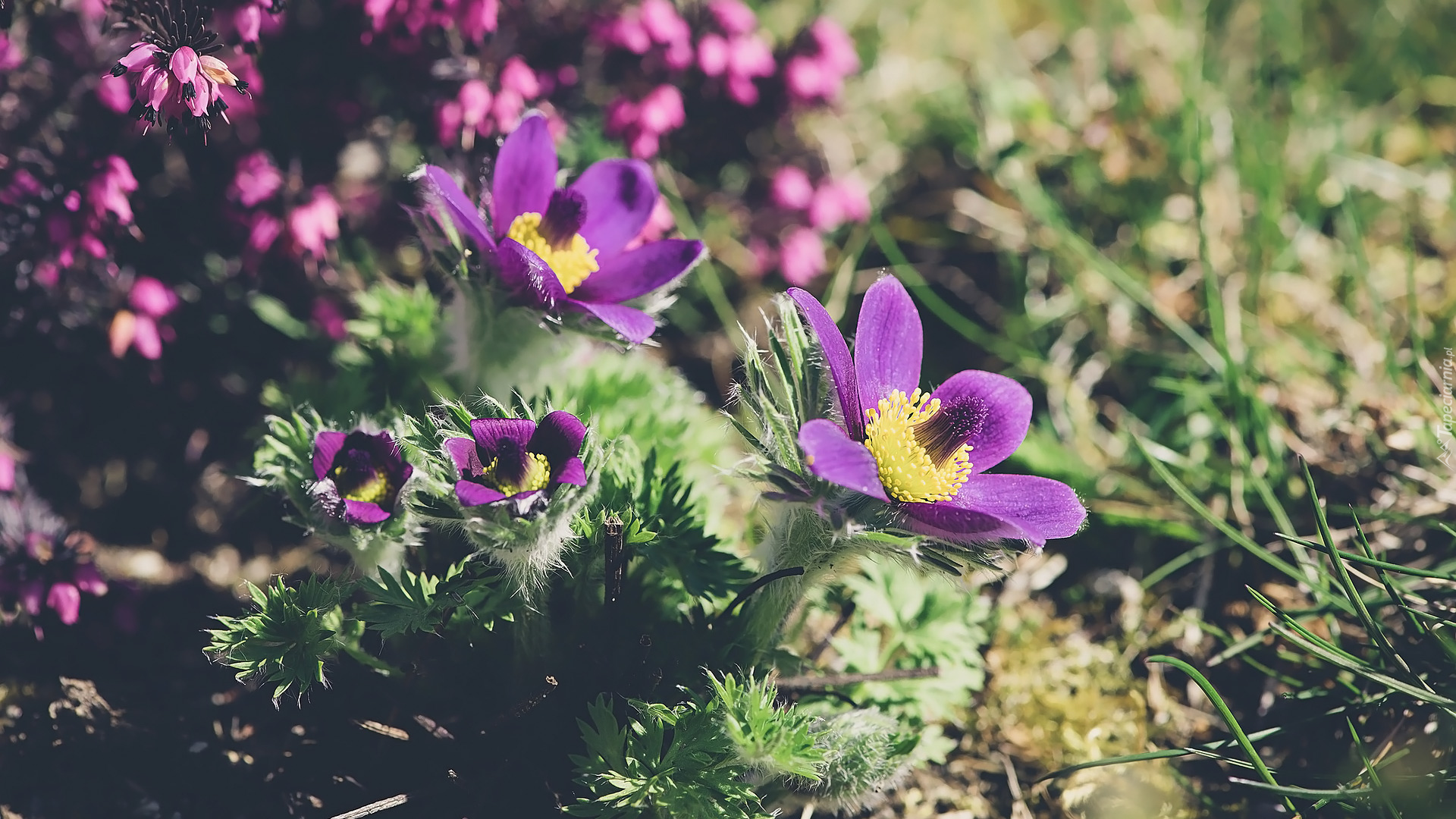 Edytor tapety: Rozświetlone kwitnące fioletowe sasanki