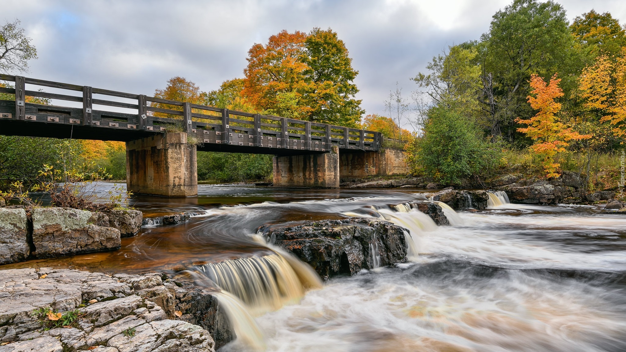 Edytor tapety: Most nad rzeką w otoczeniu kolorowych drzew