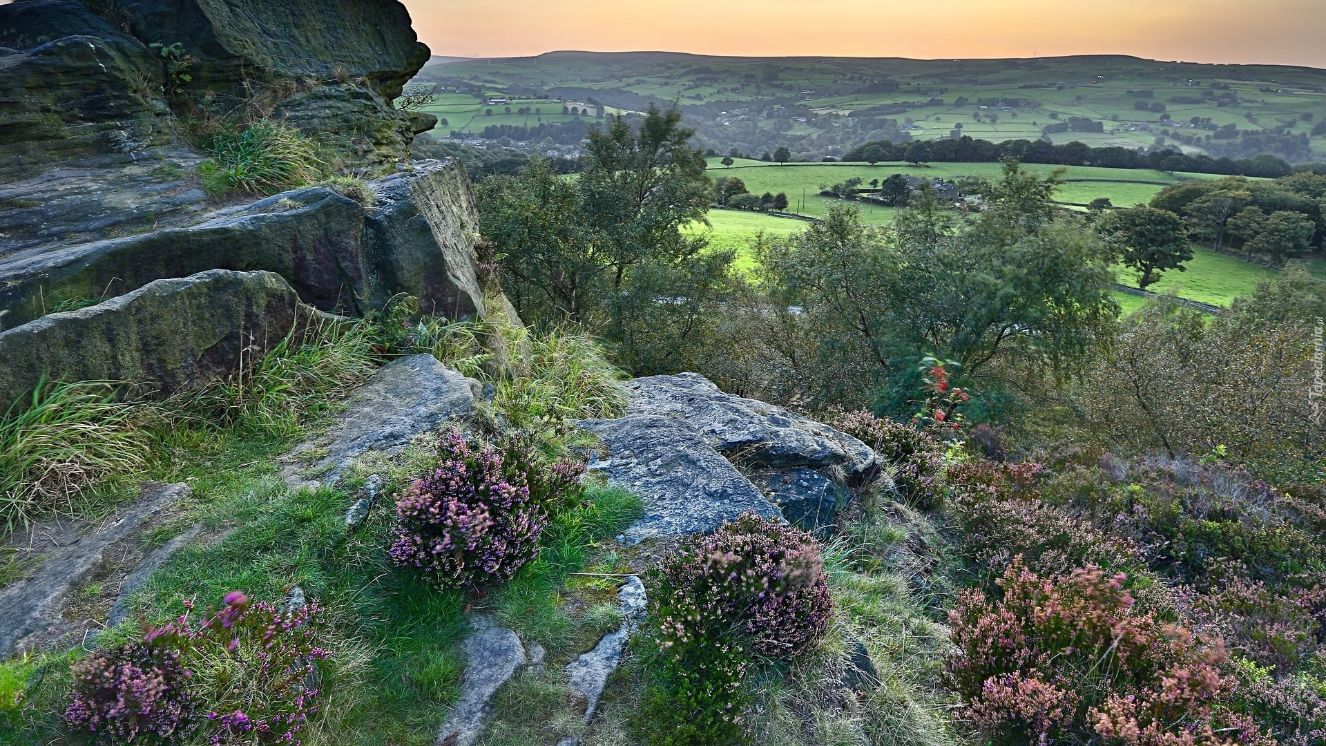 Edytor tapety: Wrzosy na skałach i widok na dolinę