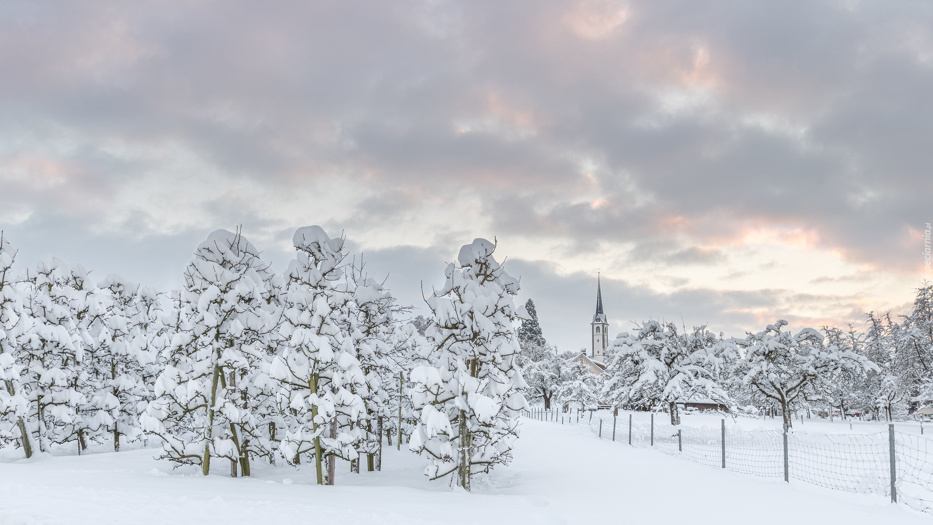 Edytor tapety: Wieża kościoła pośród ośnieżonych drzew