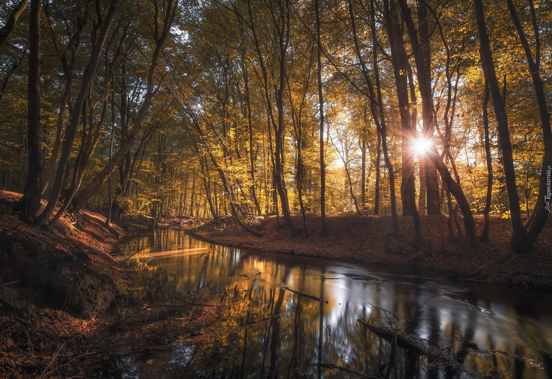 Edytor tapety: Słoneczny blask w jesiennym lesie nad rzeką