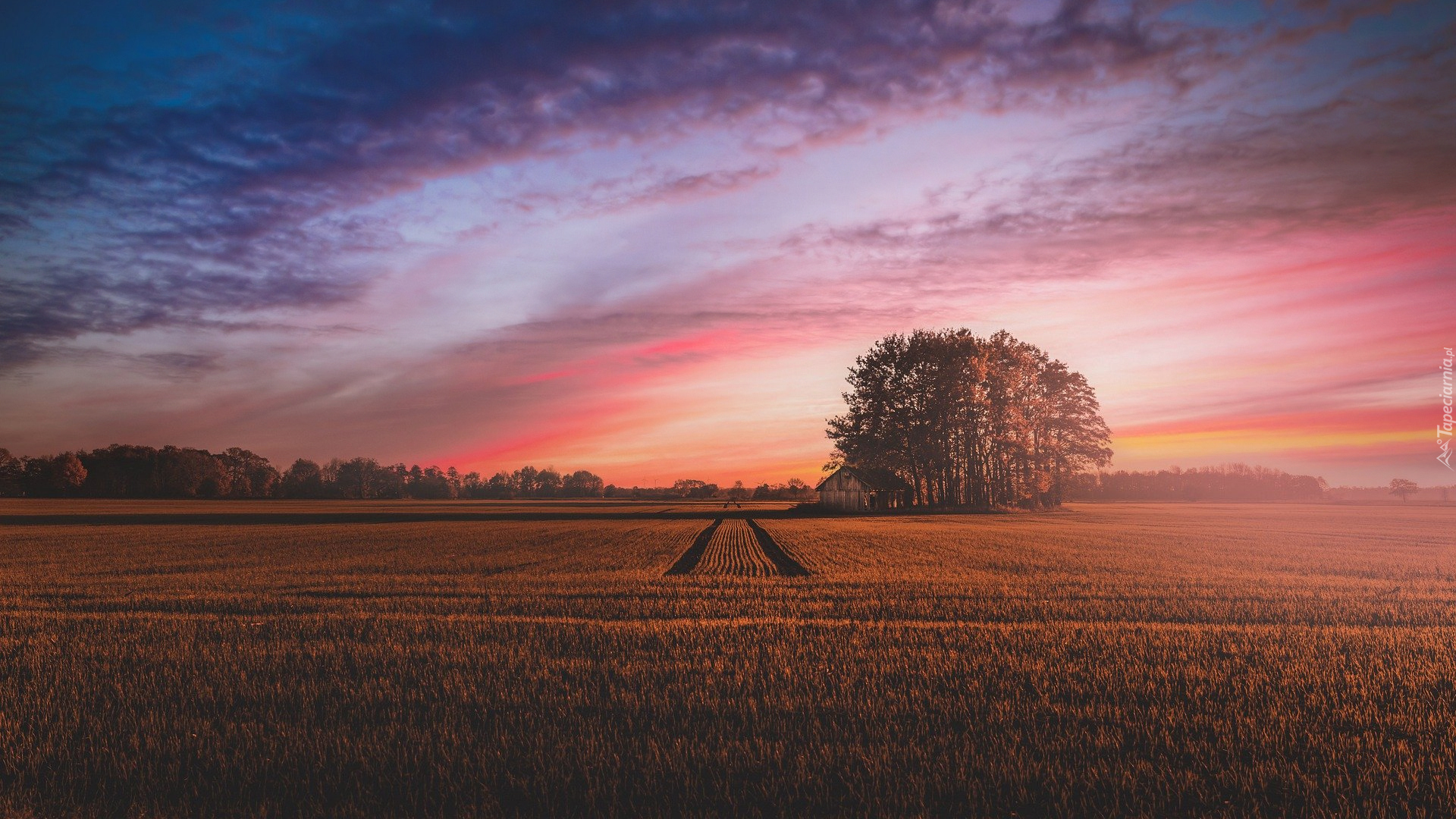 Edytor tapety: Dom pod drzewami na polu o zachodzie słońca