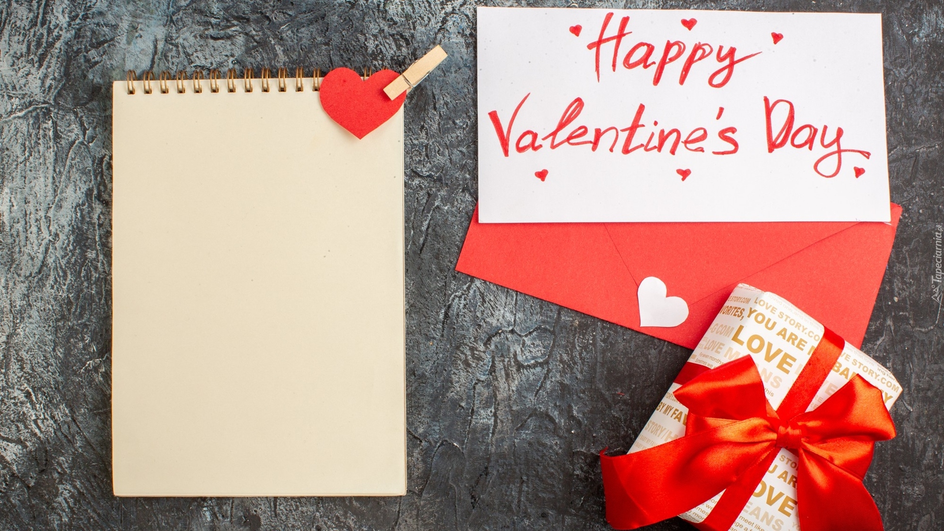Edytor tapety: Życzenia na Walentynki obok prezentu i notesu