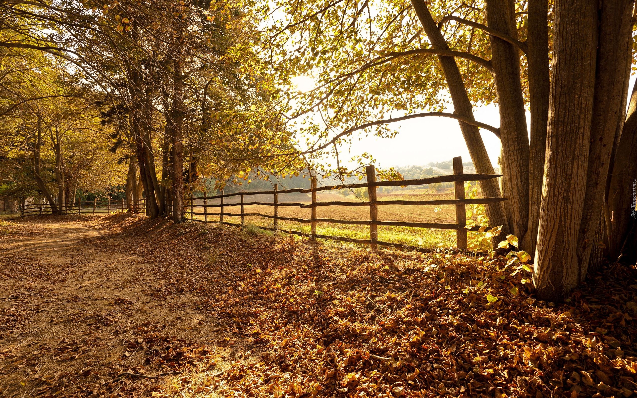 Edytor tapety: Opadłe liście pod drzewami i ogrodzeniem