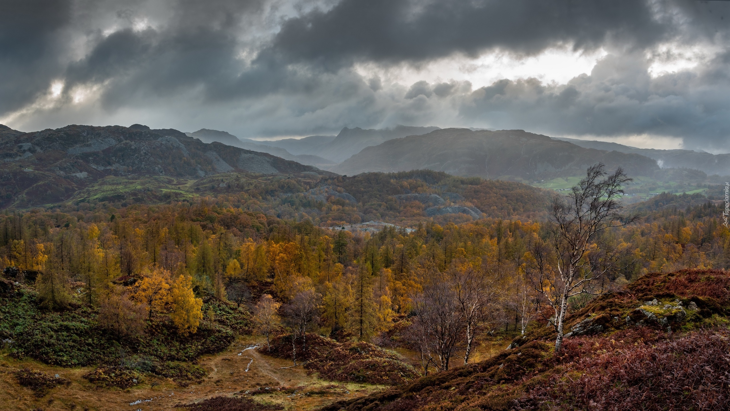 Edytor tapety: Zalesione góry jesienią pod zachmurzonym niebem