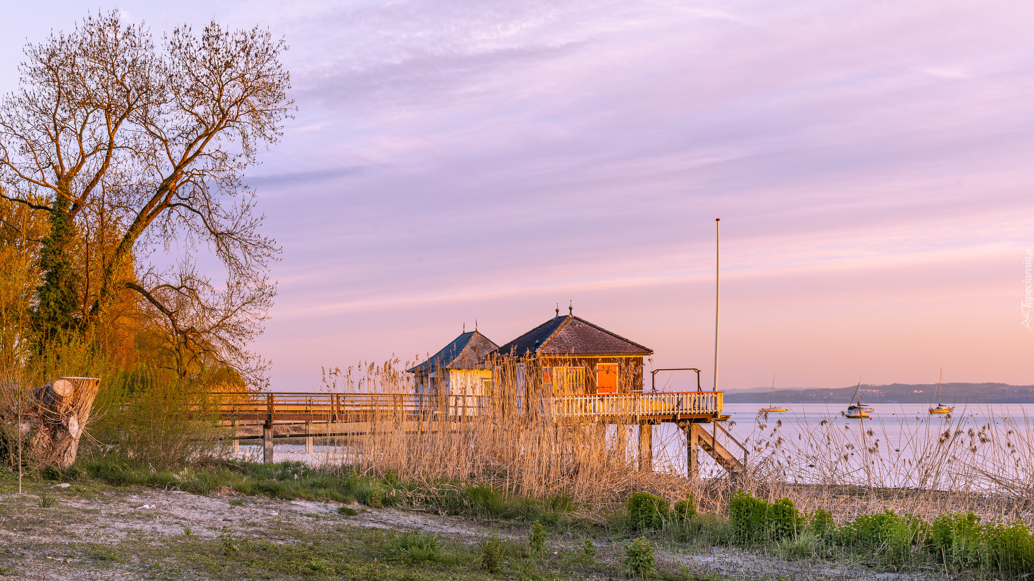 Edytor tapety: Żaglówki na jeziorze i domy na pomoście