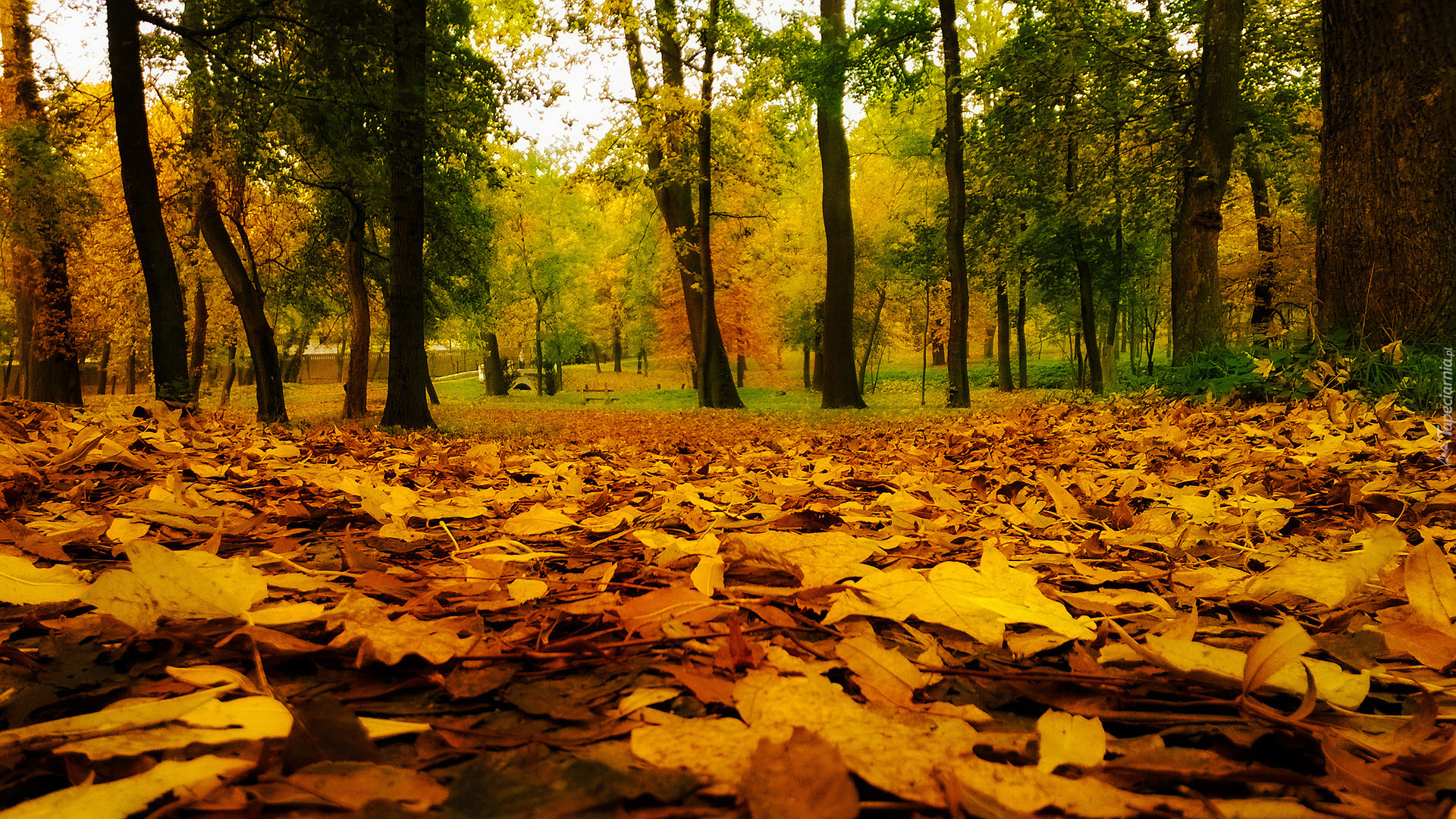 Edytor tapety: Jesienne liście na trawie pod drzewami