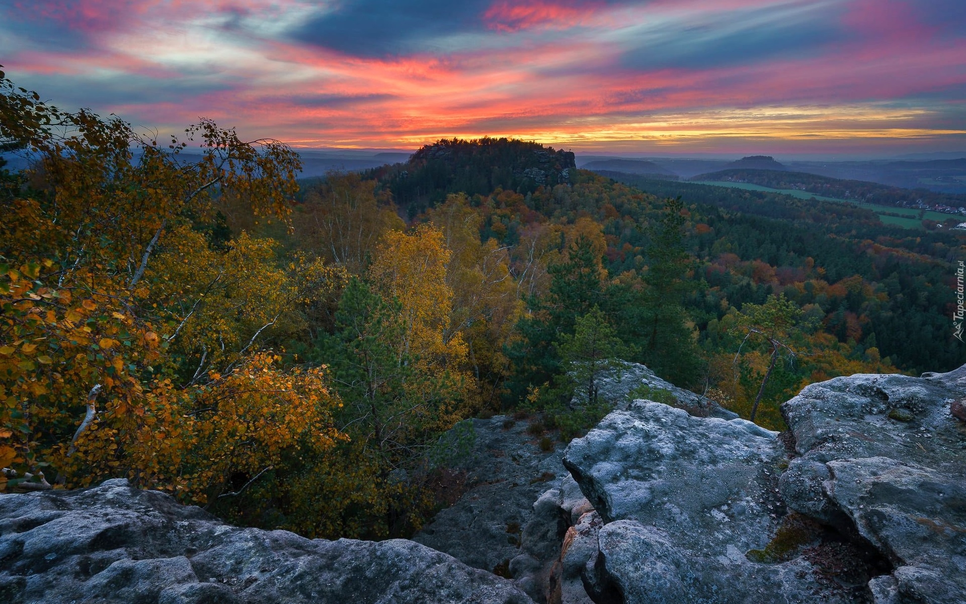 Edytor tapety: Park Narodowy Saskiej Szwajcarii jesienią o zachodzie słońca