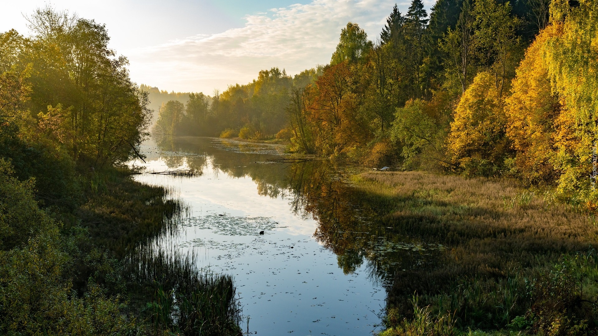 Edytor tapety: Rozświetlone jesienne drzewa nad rzeką