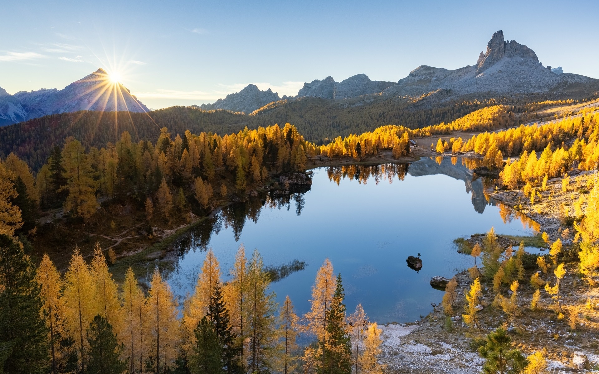 Edytor tapety: Promienie słońca nad lasami i górskim jeziorem
