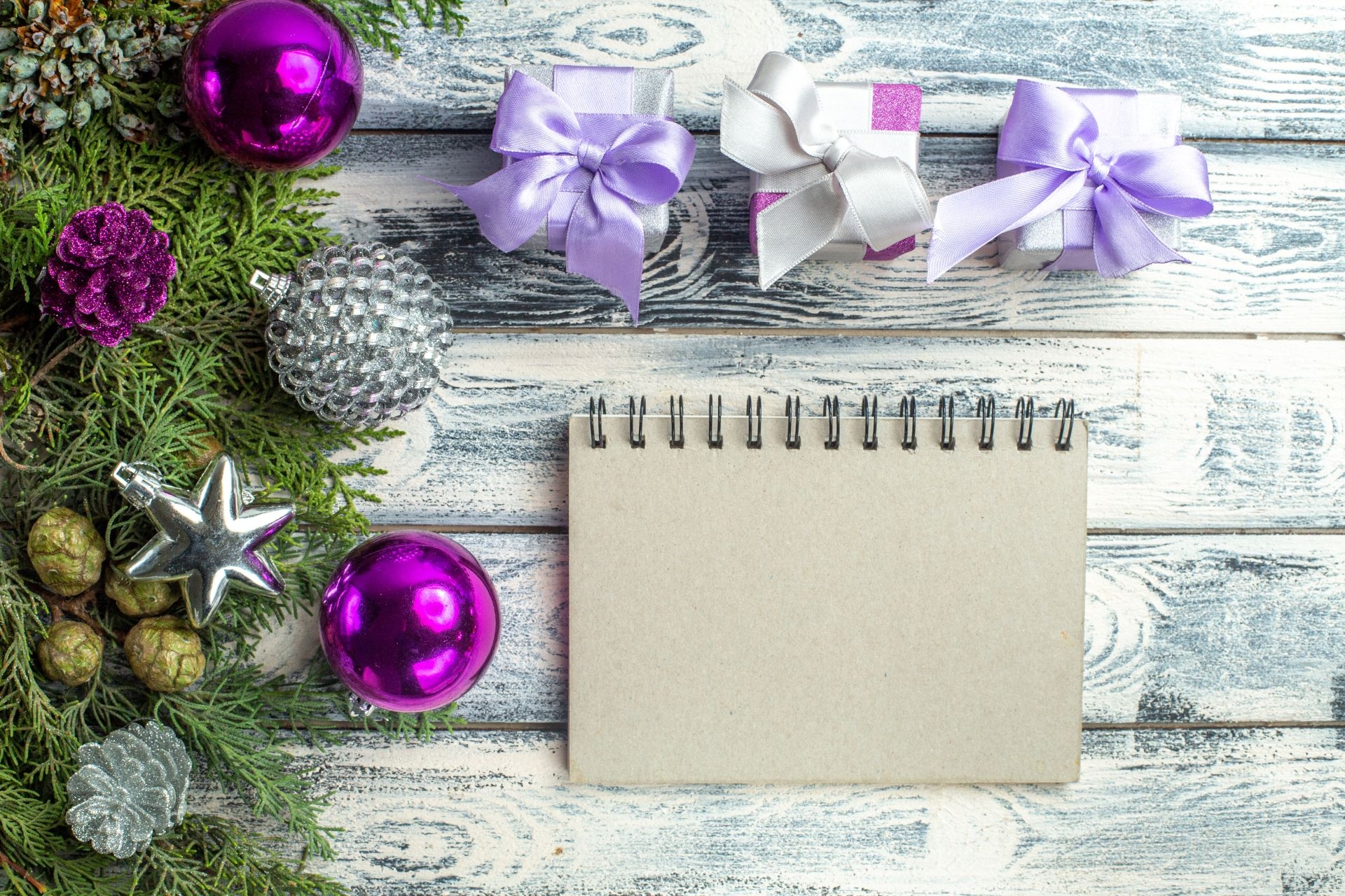 Edytor tapety: Prezenty i notatnik obok bombek na gałązkach