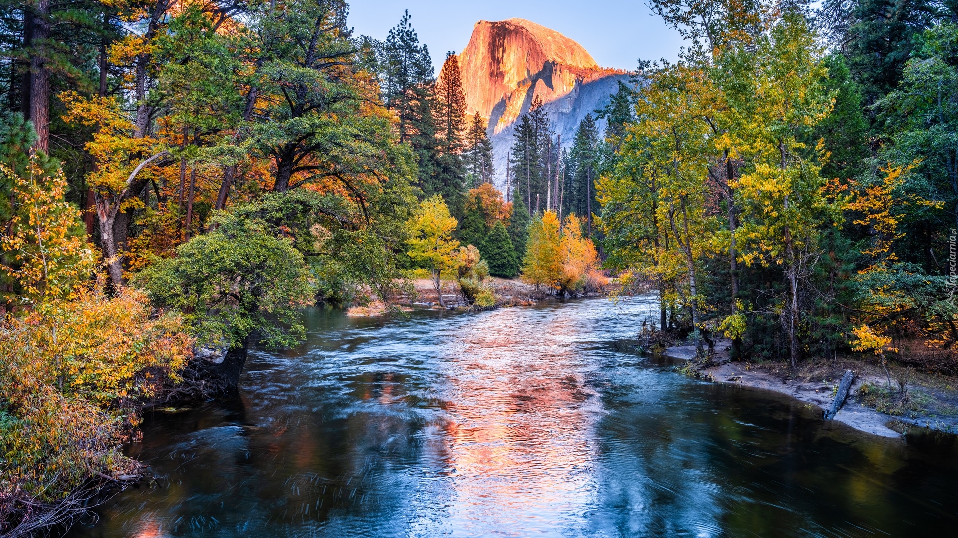 Edytor tapety: Rzeka Merced River i rozświetlony szczyt Half Dome