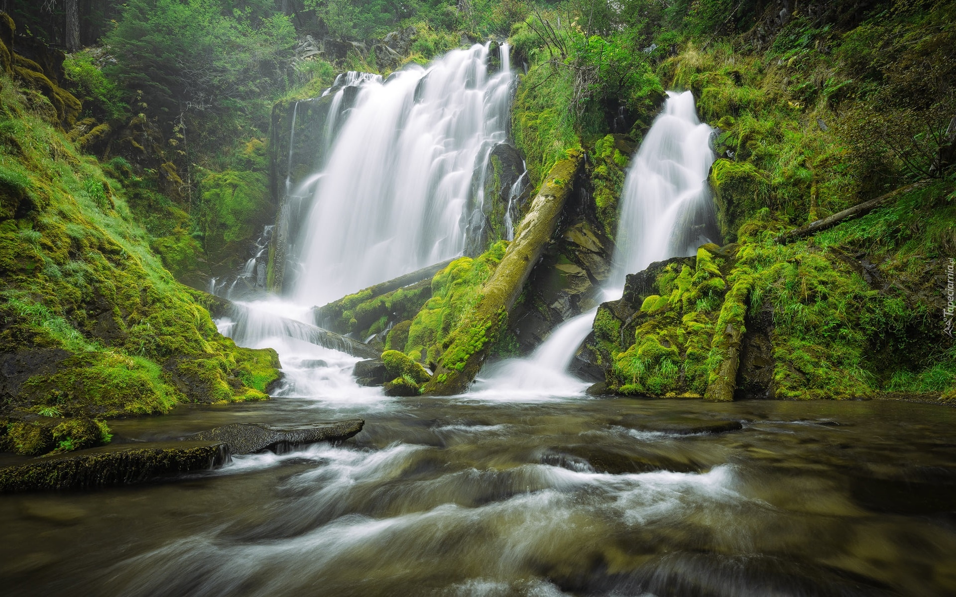 Edytor tapety: Leśny wodospad na omszałych skałach spływający do rzeki
