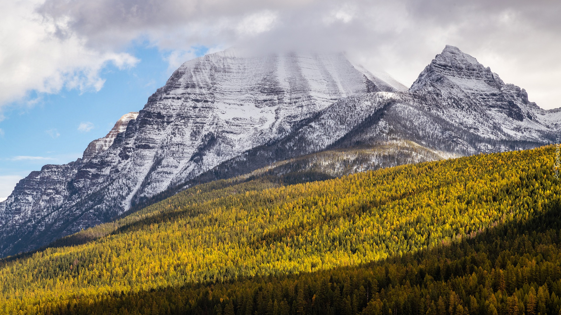 Edytor tapety: Zielony las pod ośnieżoną górą