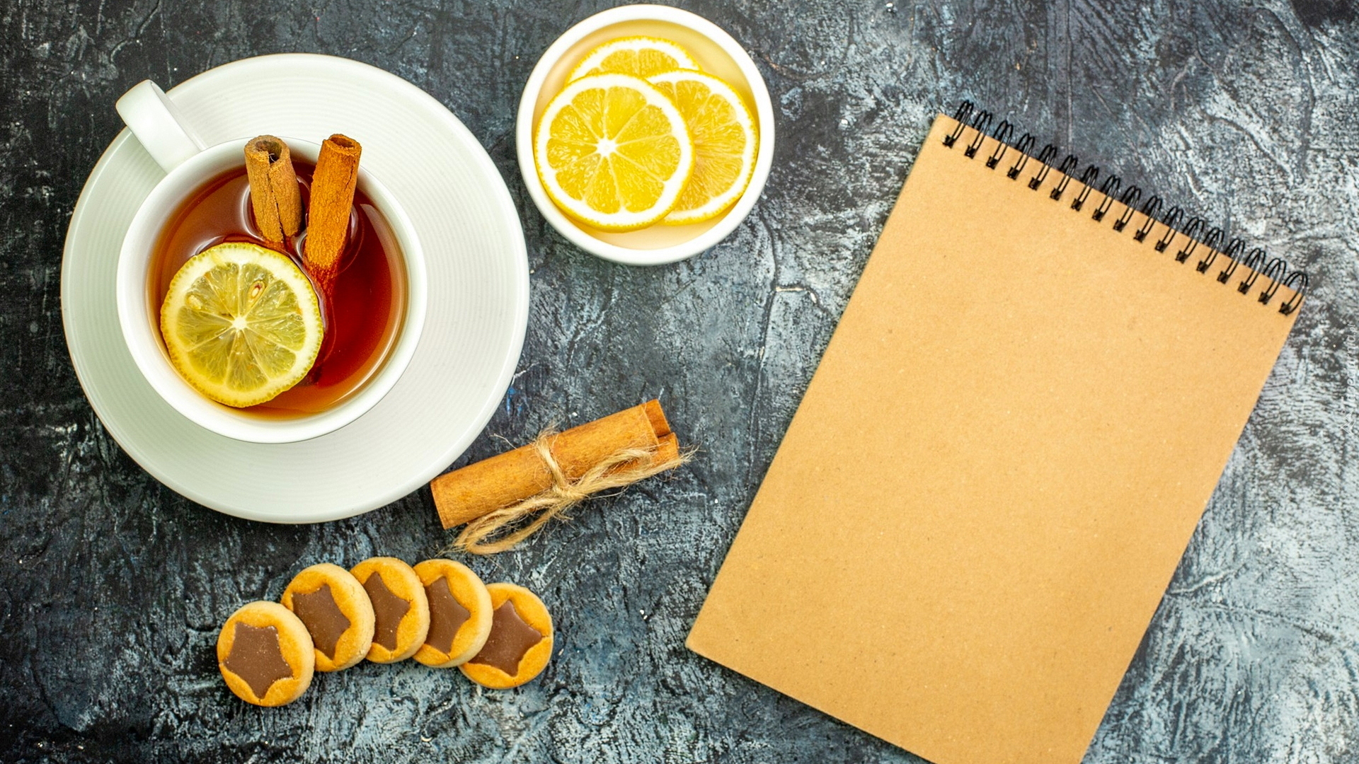 Edytor tapety: Filiżanka herbaty i ciasteczka obok notesu