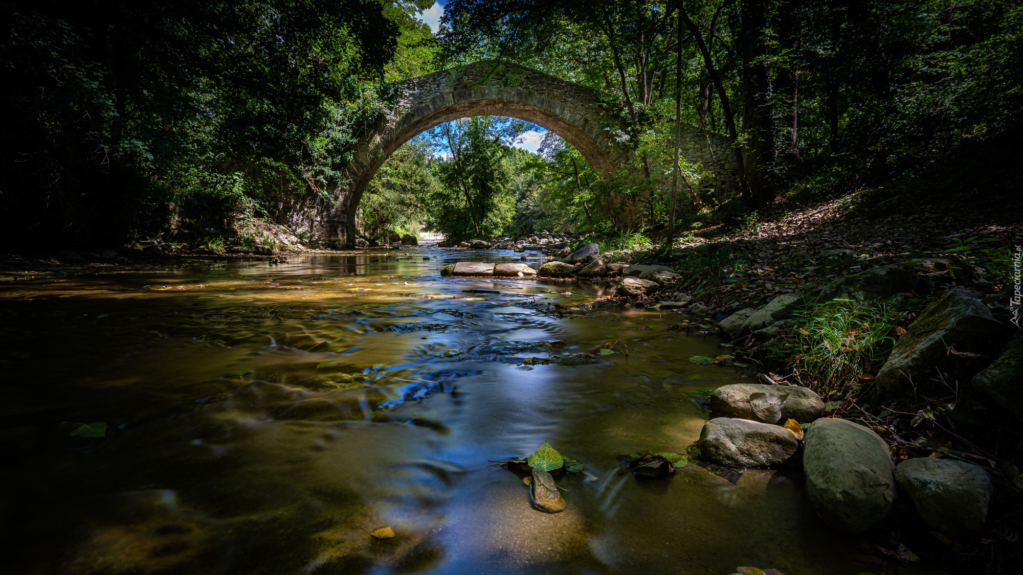 Edytor tapety: Łukowy most nad rzeką w lesie