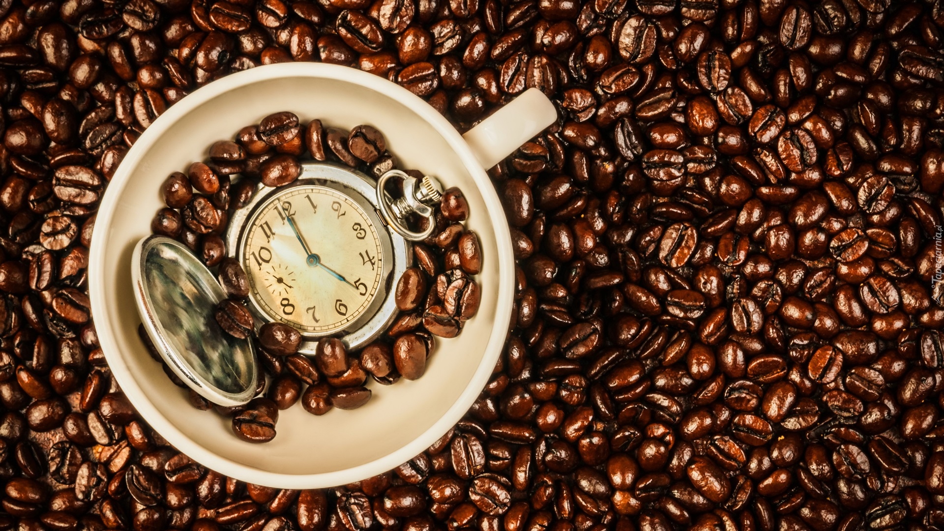 Edytor tapety: Zegarek w filiżance na ziarnkach kawy