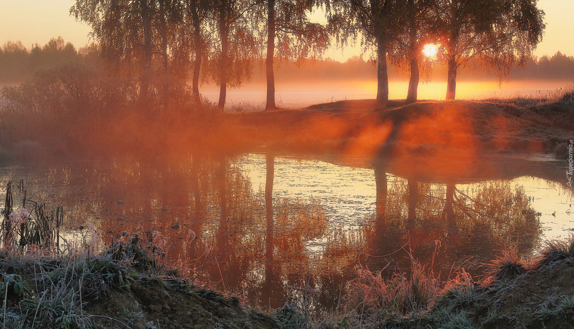 Edytor tapety: Drzewa nad zamglonym stawem o wschodzie słońca