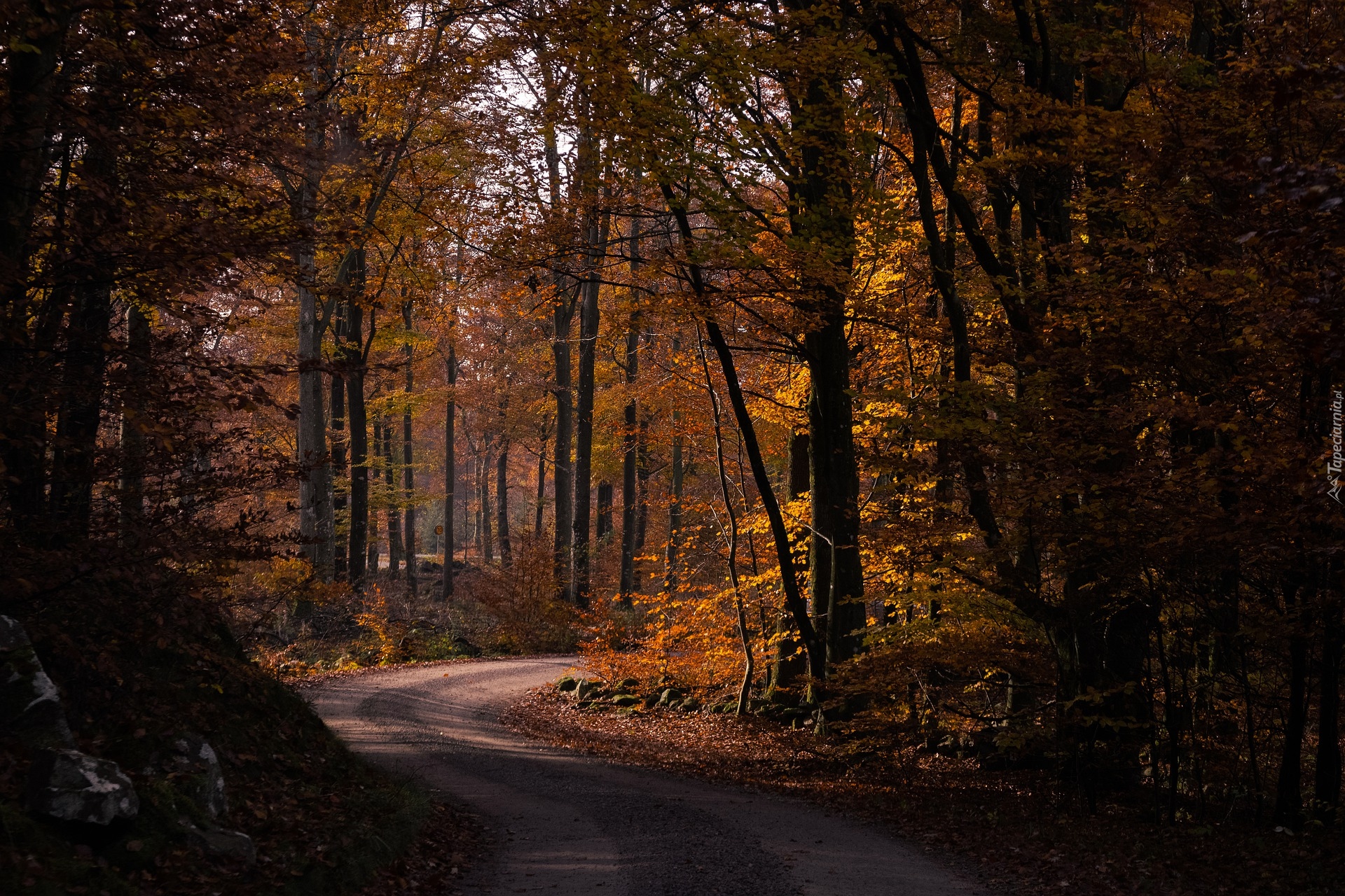 Edytor tapety: Rozświetlone jesienne drzewa przy drodze przez las