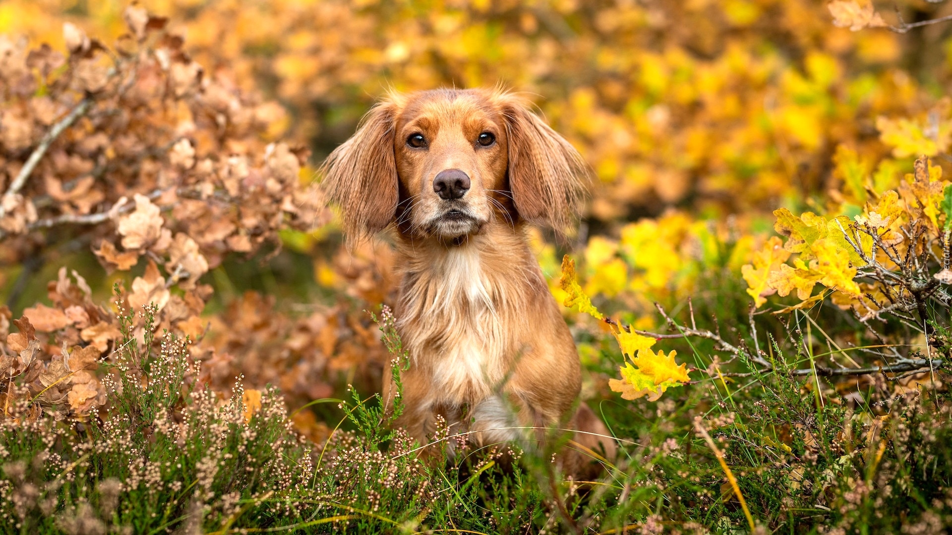 Edytor tapety: Working cocker spaniel pośród jesiennych liści i wrzosów