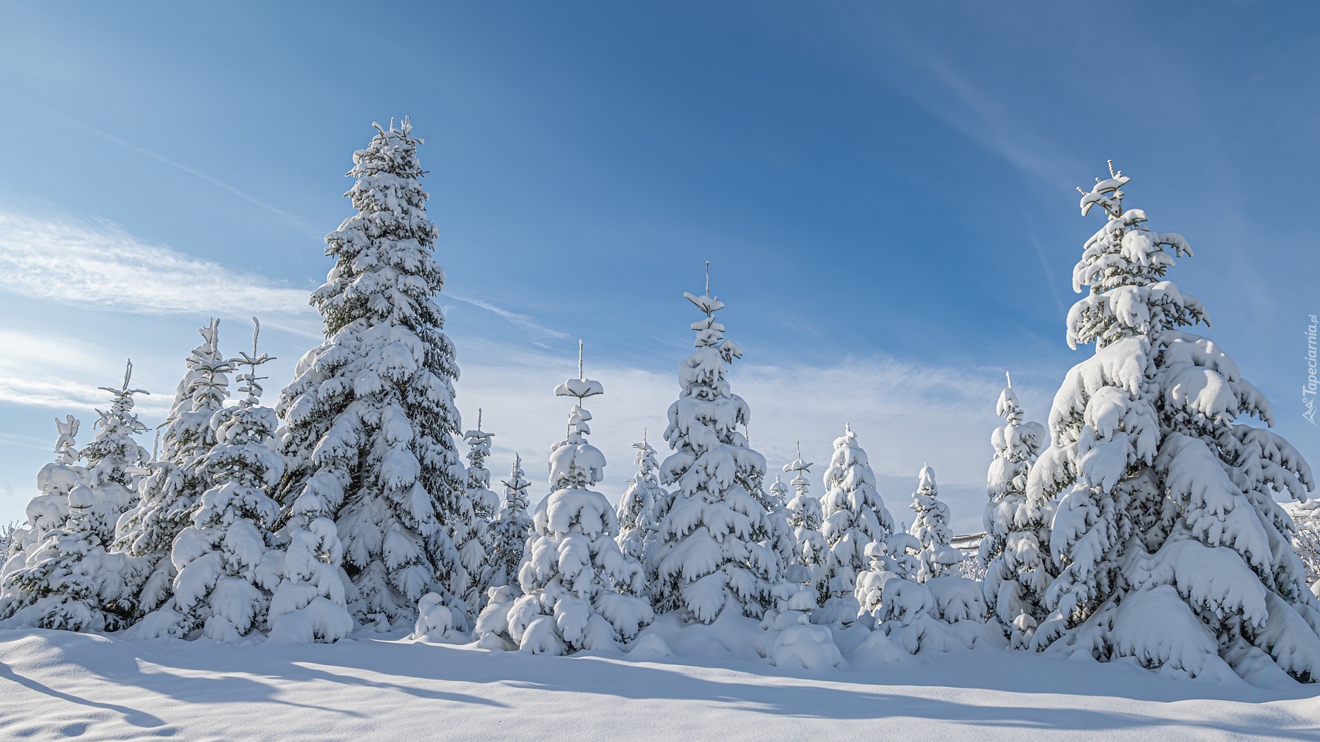 Edytor tapety: Zasypane śniegiem drzewa iglaste w słonecznym blasku