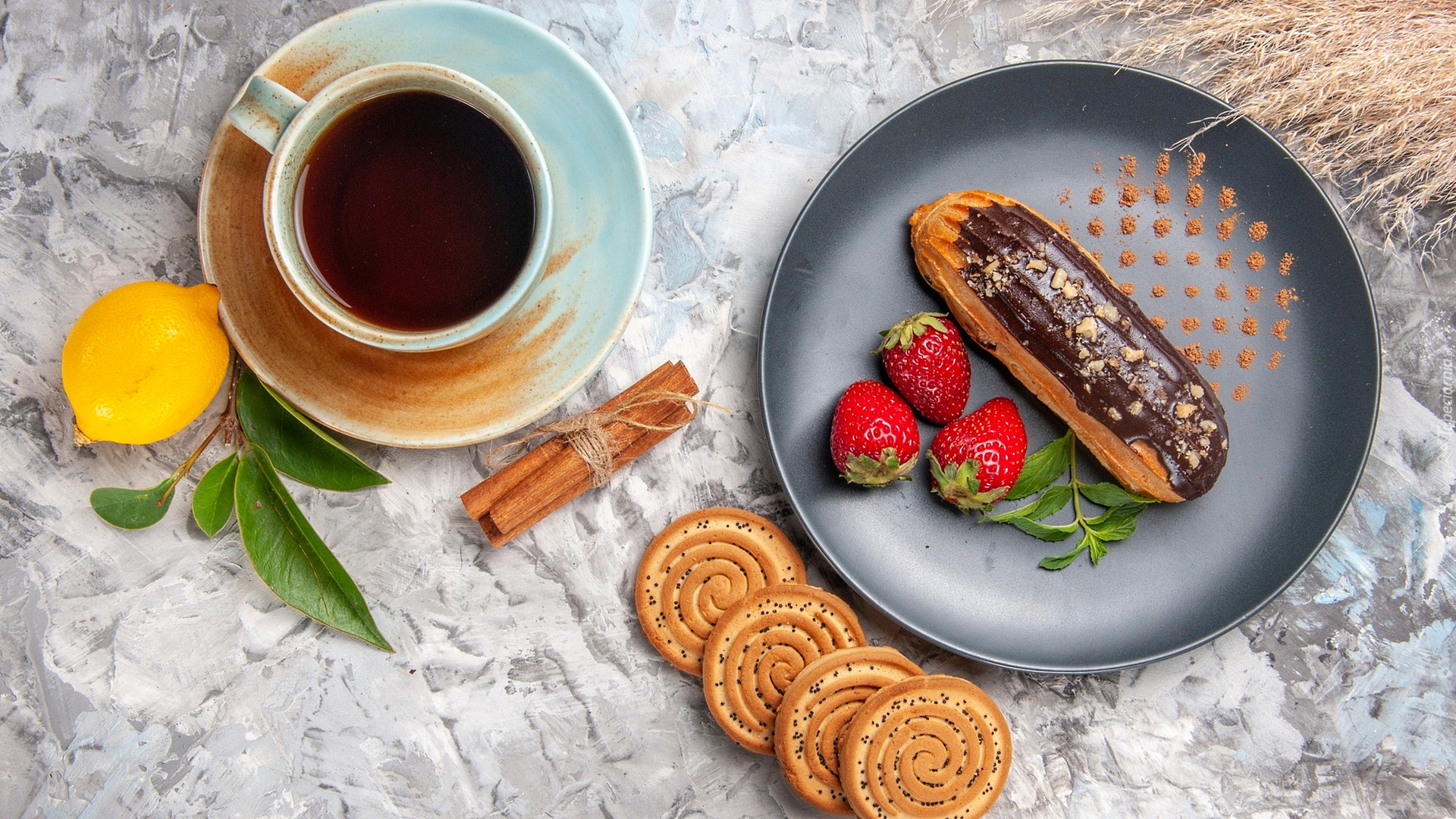 Edytor tapety: Filiżanka kawy obok talerzyka z eklerkiem i truskawkami