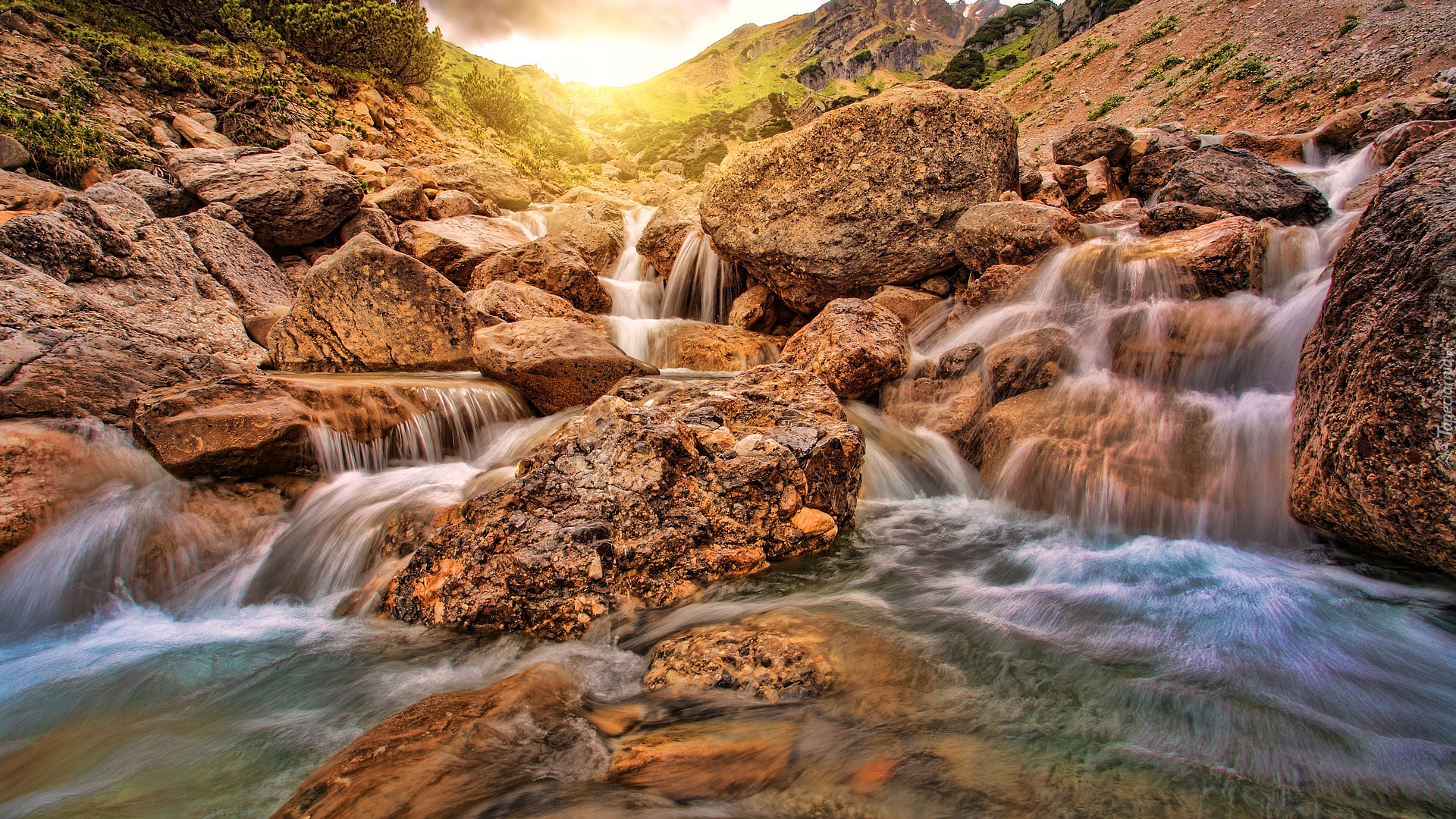 Edytor tapety: Wodospad na skałach o wschodzie słońca