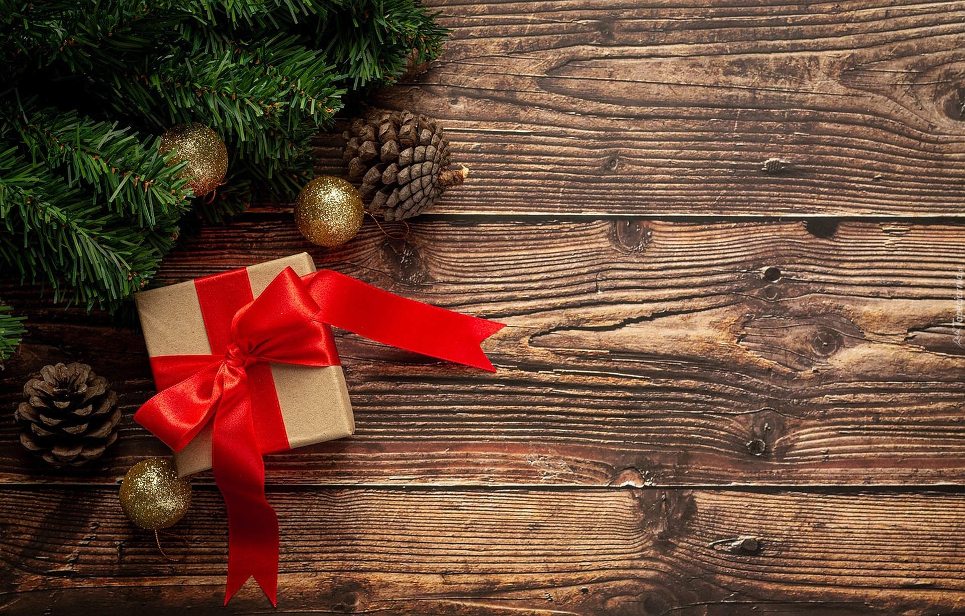 Edytor tapety: Prezent obok ozdób i gałązki na deskach
