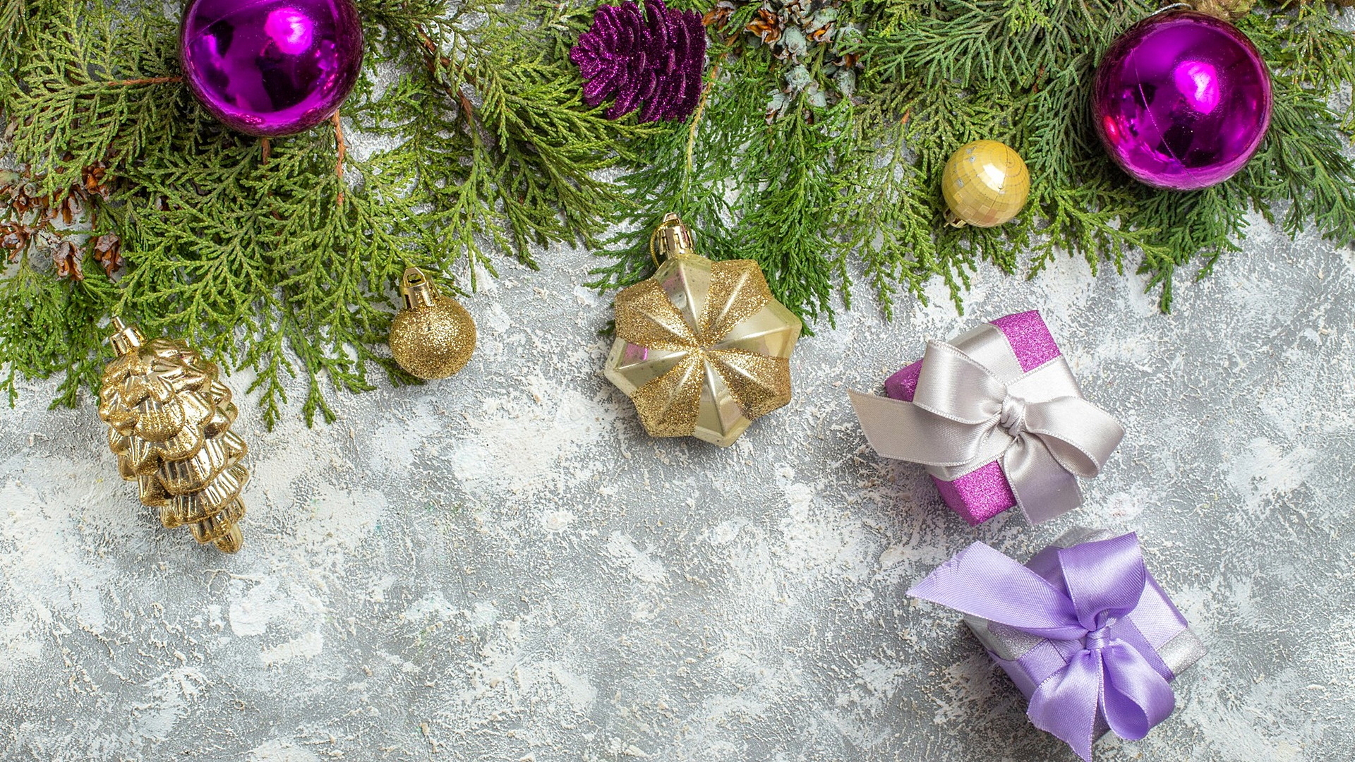 Edytor tapety: Prezenty obok bombek na zielonych gałązkach
