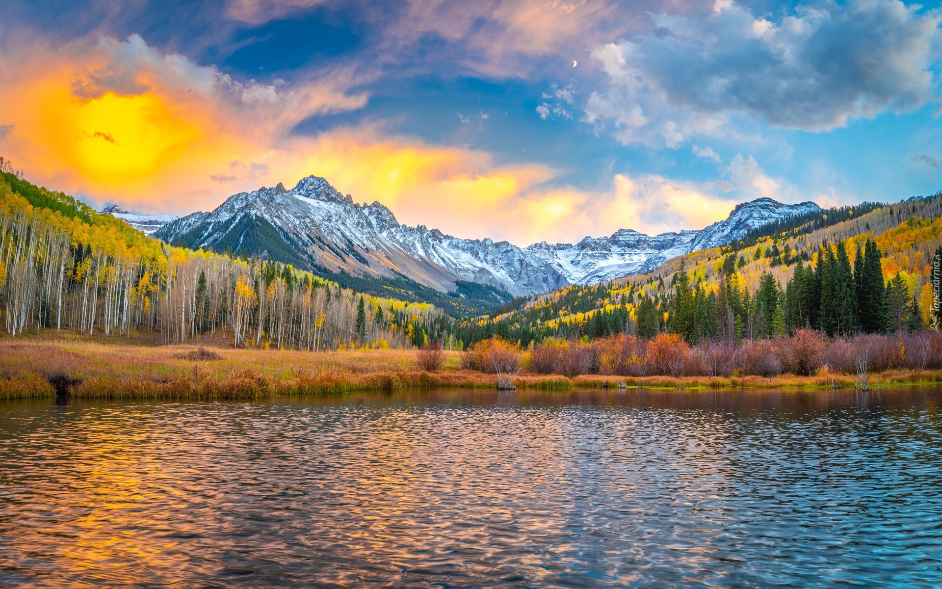 Edytor tapety: Jezioro z widokiem na góry we wschodzącym słońcu
