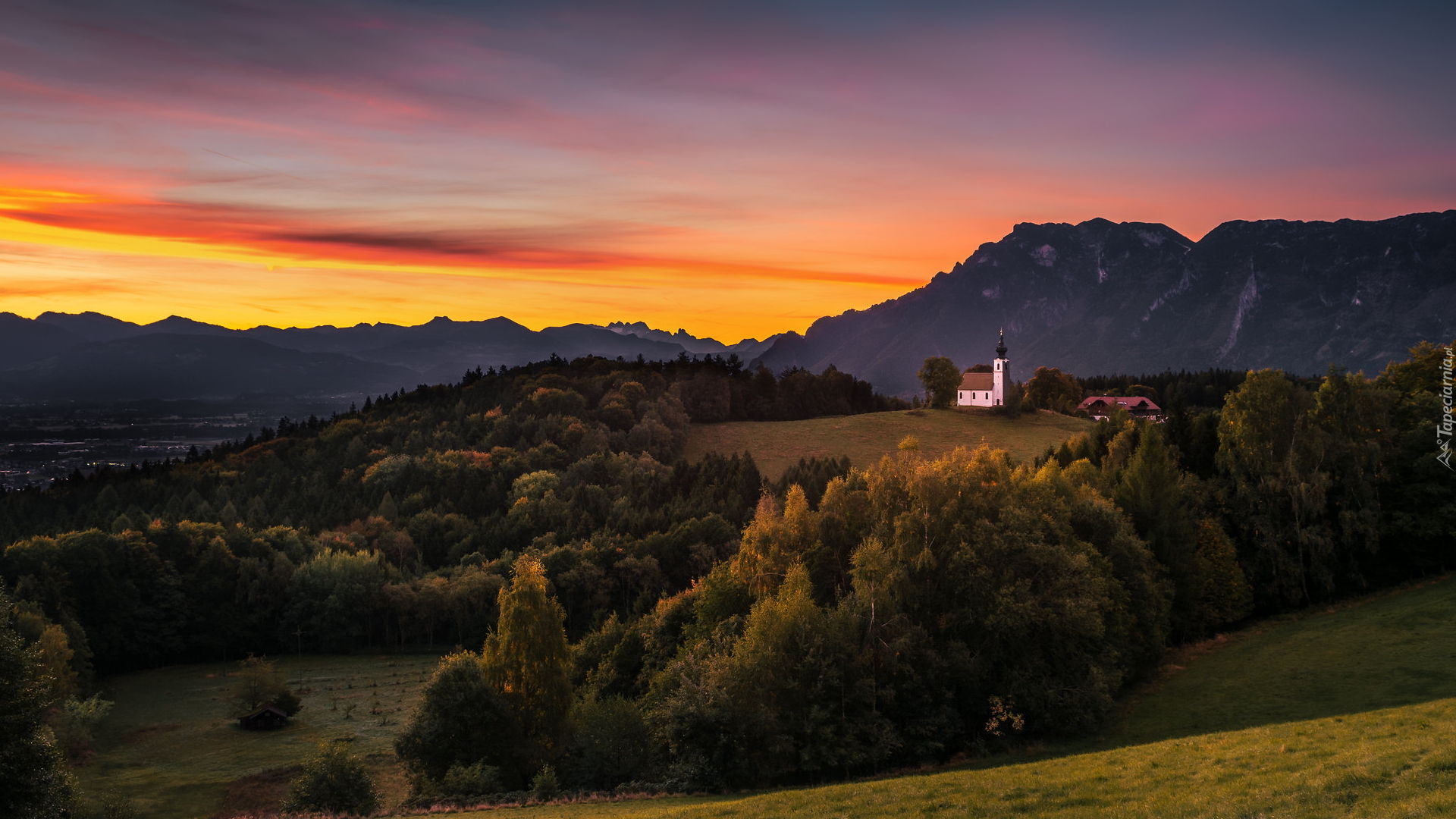 Edytor tapety: Kościół na wzgórzu na tle gór w Berchtesgadener