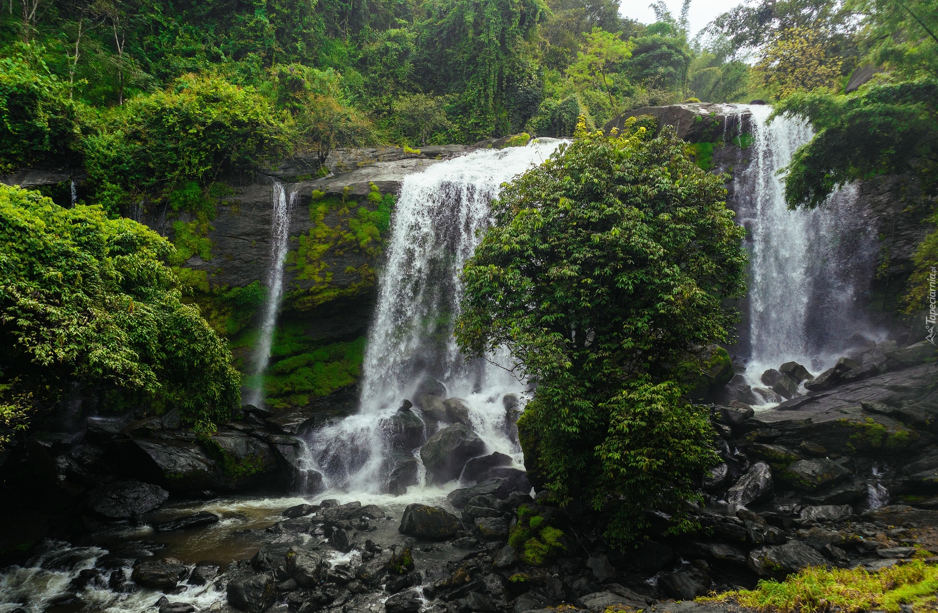 Edytor tapety: Zielone drzewa przy wodospadach na skałach
